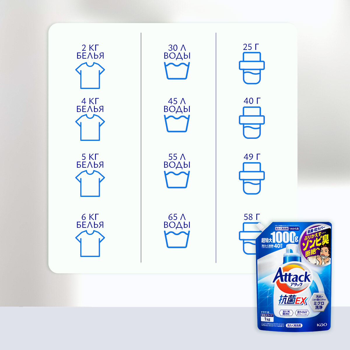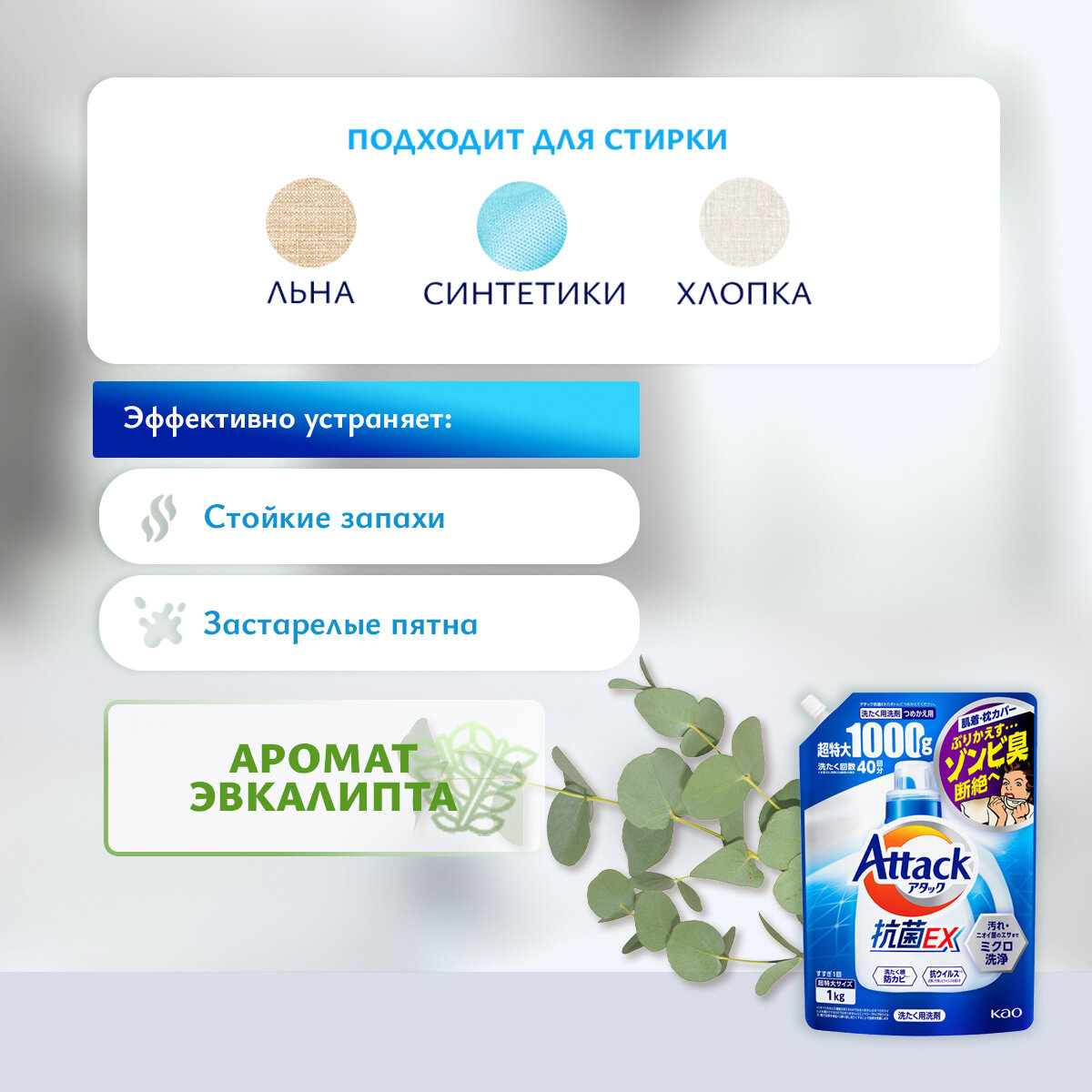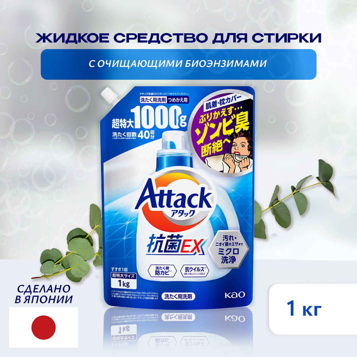KAO Жидкое средство для стирки Attack EX (концентрат, для сушки белья в помещении) 1 кг, мягкая упаковка с крышкой