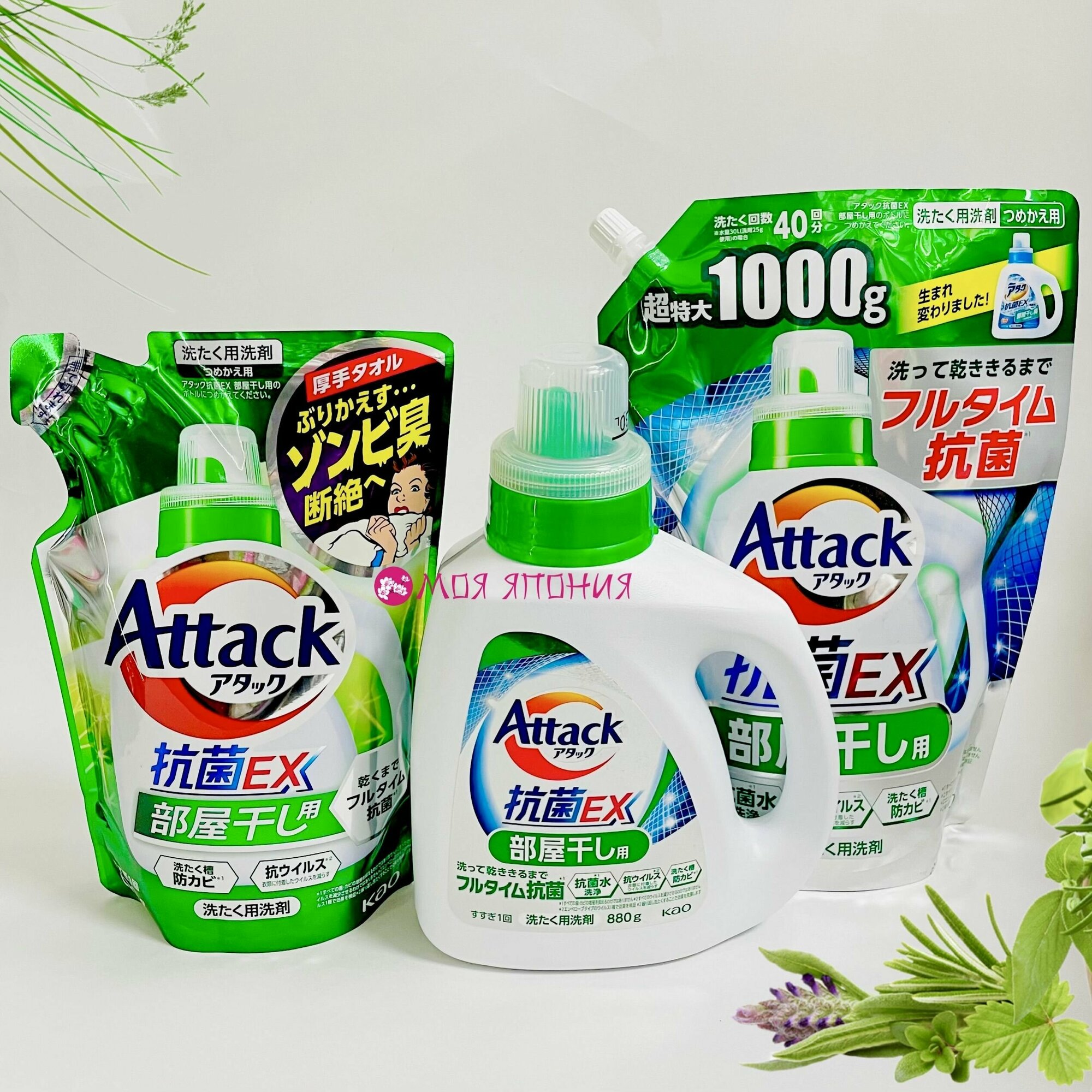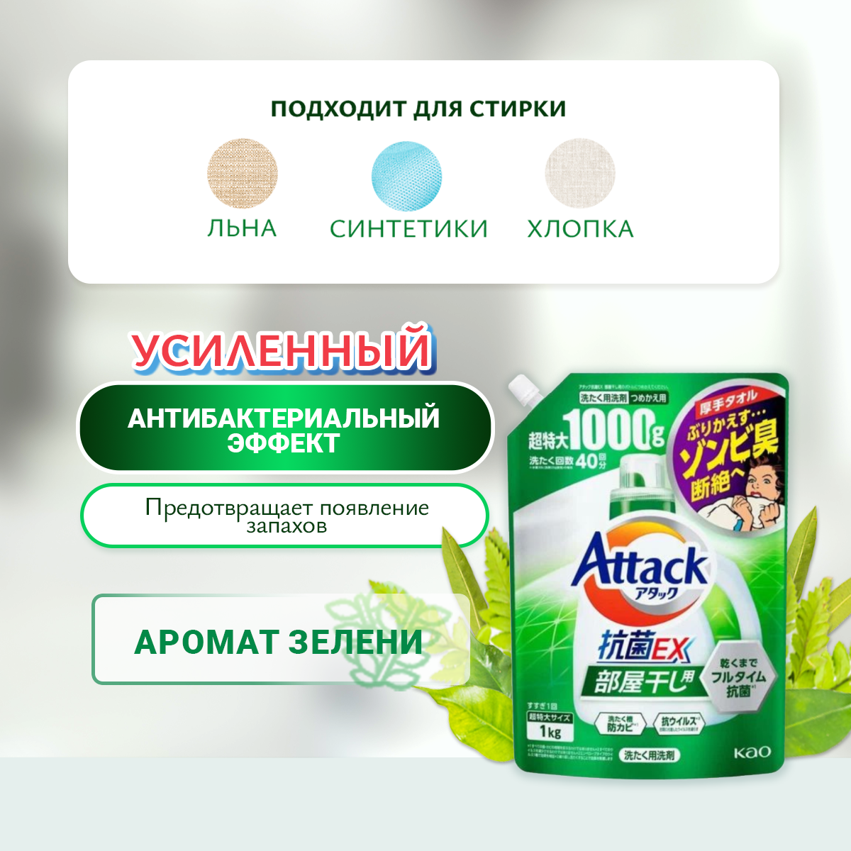 KAO Attack Жидкое средство для стирки белья с антибактериальным эффектом и сушки в помещении сменная упаковка 1000 гр