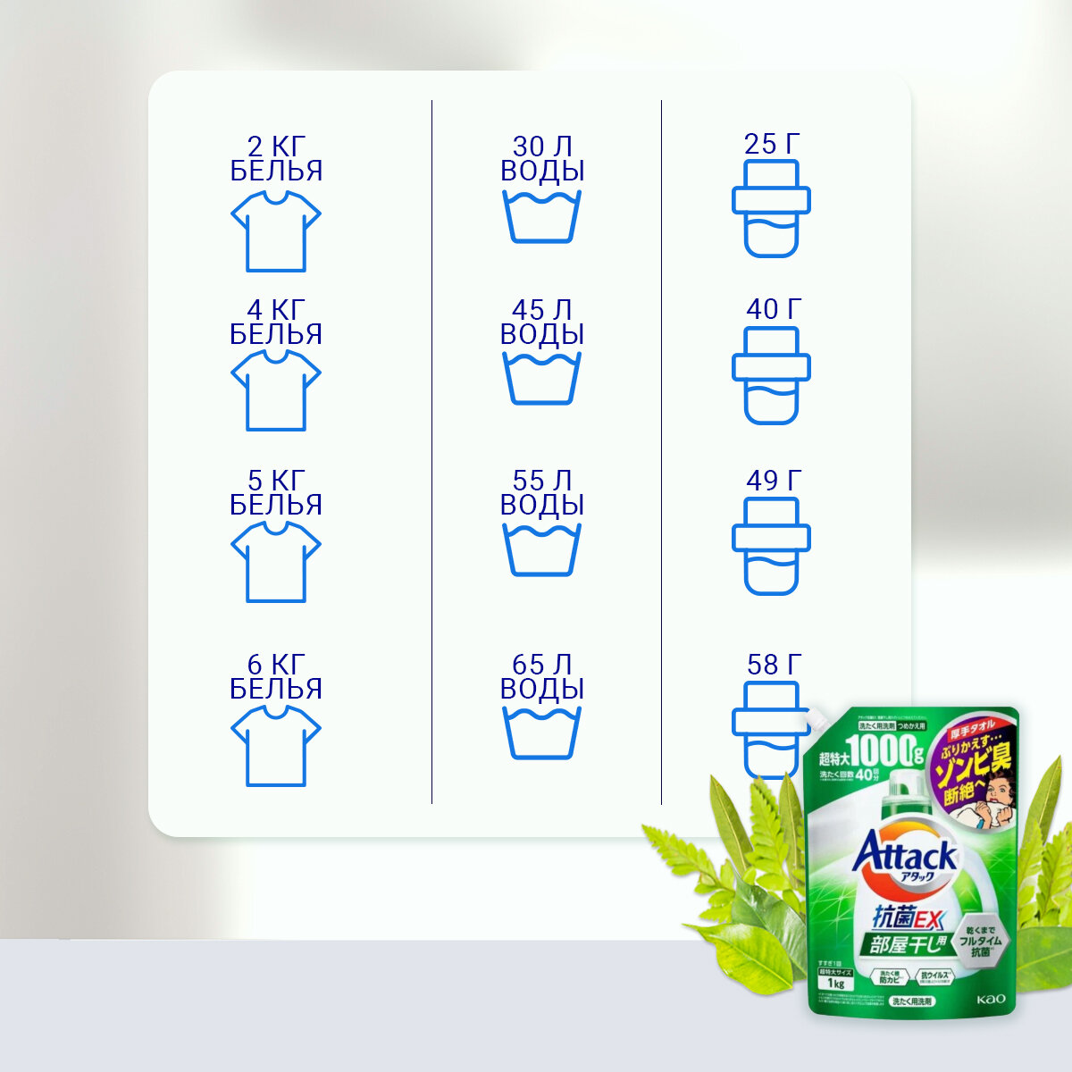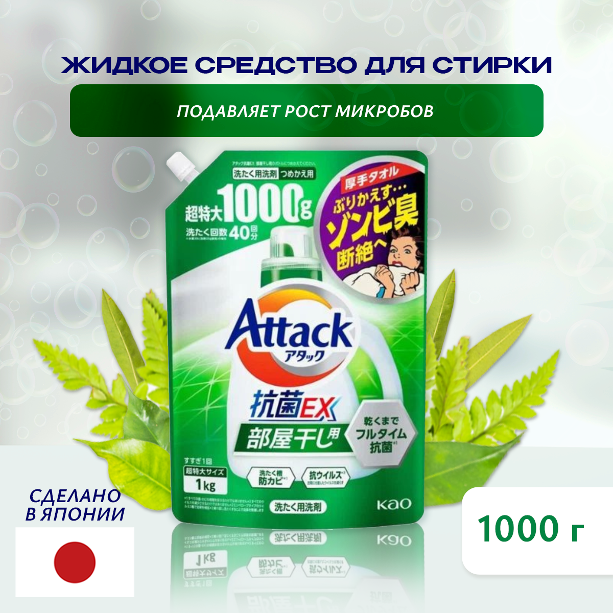 KAO Жидкое средство для стирки Attack EX (концентрат, для сушки белья в помещении) 1 кг, мягкая упаковка с крышкой