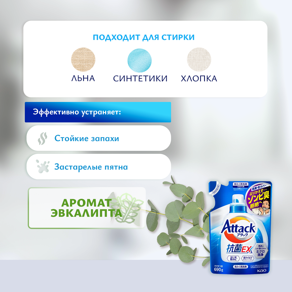 KAO Гель для стирки белья Attack EX Multi-Action ВСЕ В одном Высокоэффективный многофункциональный антибактериальный для сушки в помещении, аромат свежести, 690 гр. сменная упаковка