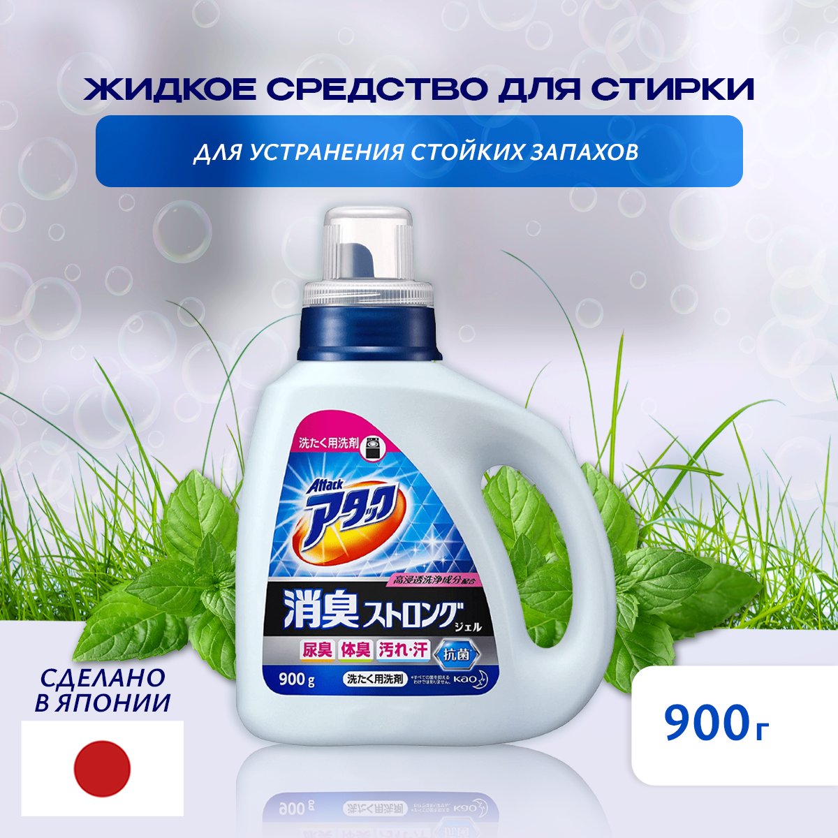 Гель для стирки КАО Attack Deodorant Strong, дезодорирующий, с ароматом трав (900 гр)