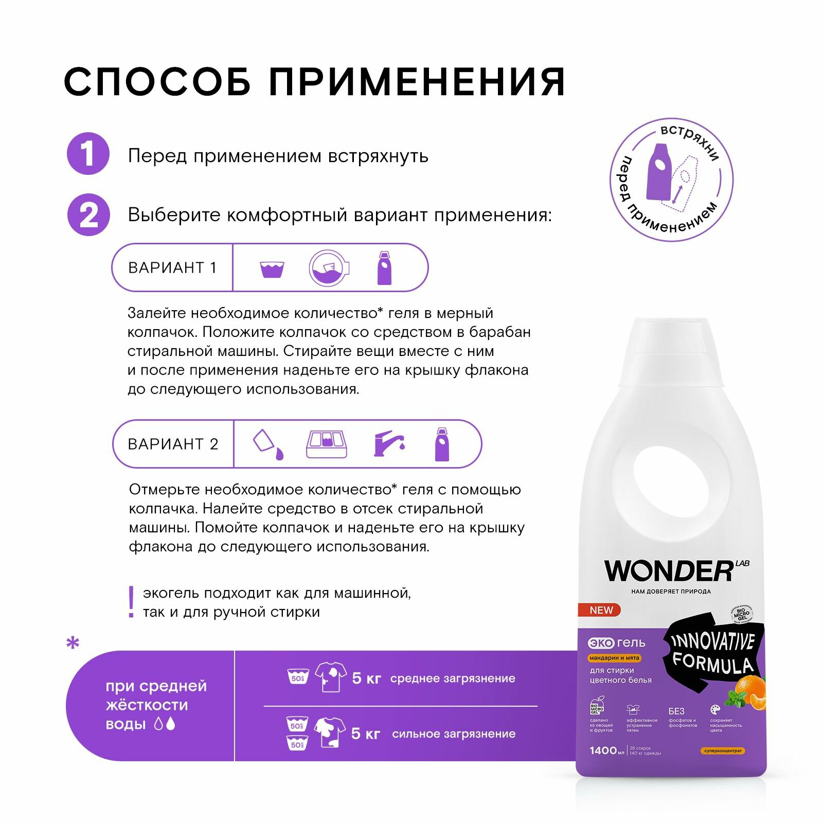 WonderLab Экогель для Стирки Цветного белья (мандарин и мята) {28 стирок} 1,4л