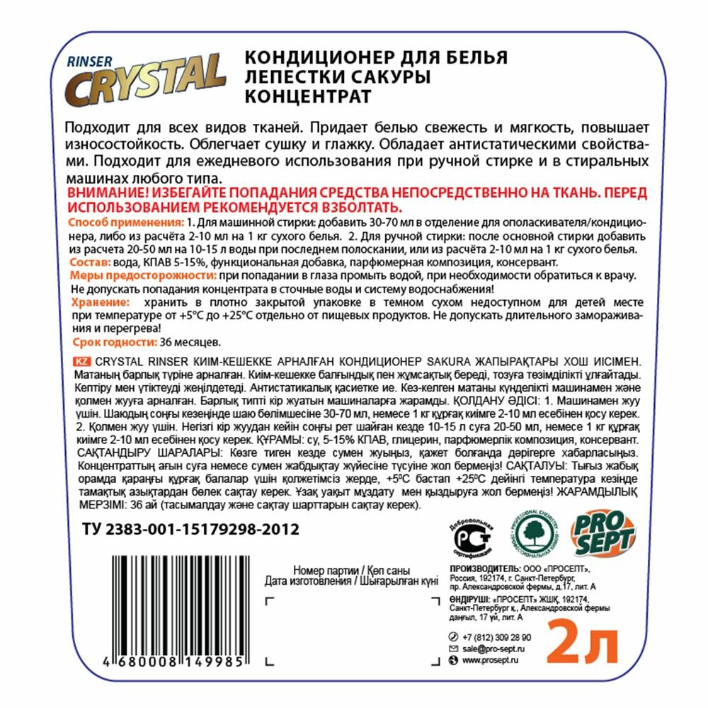 Купить Кондиционер-ополаскиватель для белья Prosept Crystal Rinser Лепестки Сакуры, концентрат, 2 л