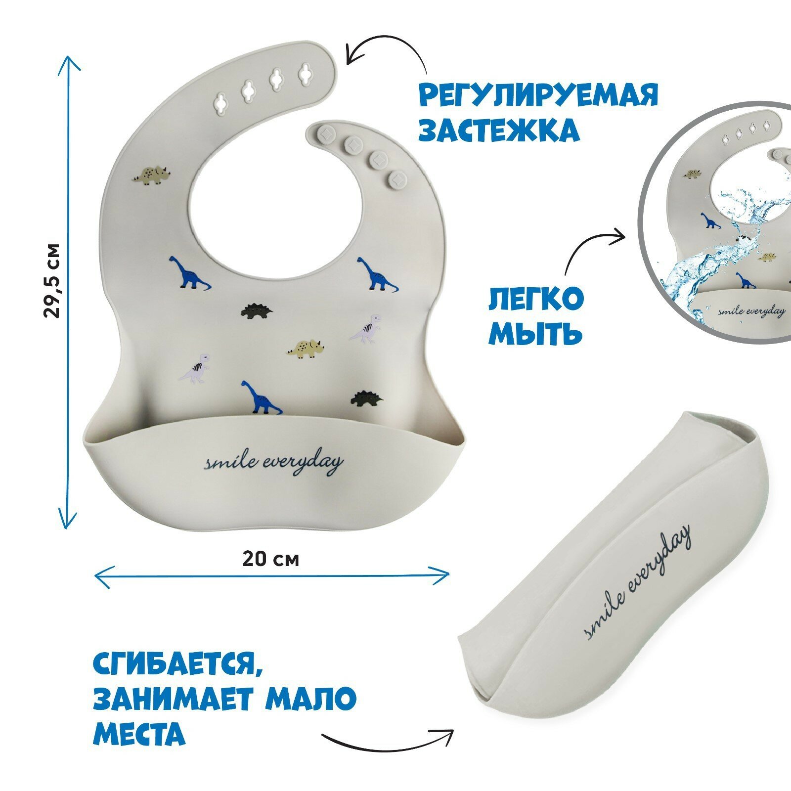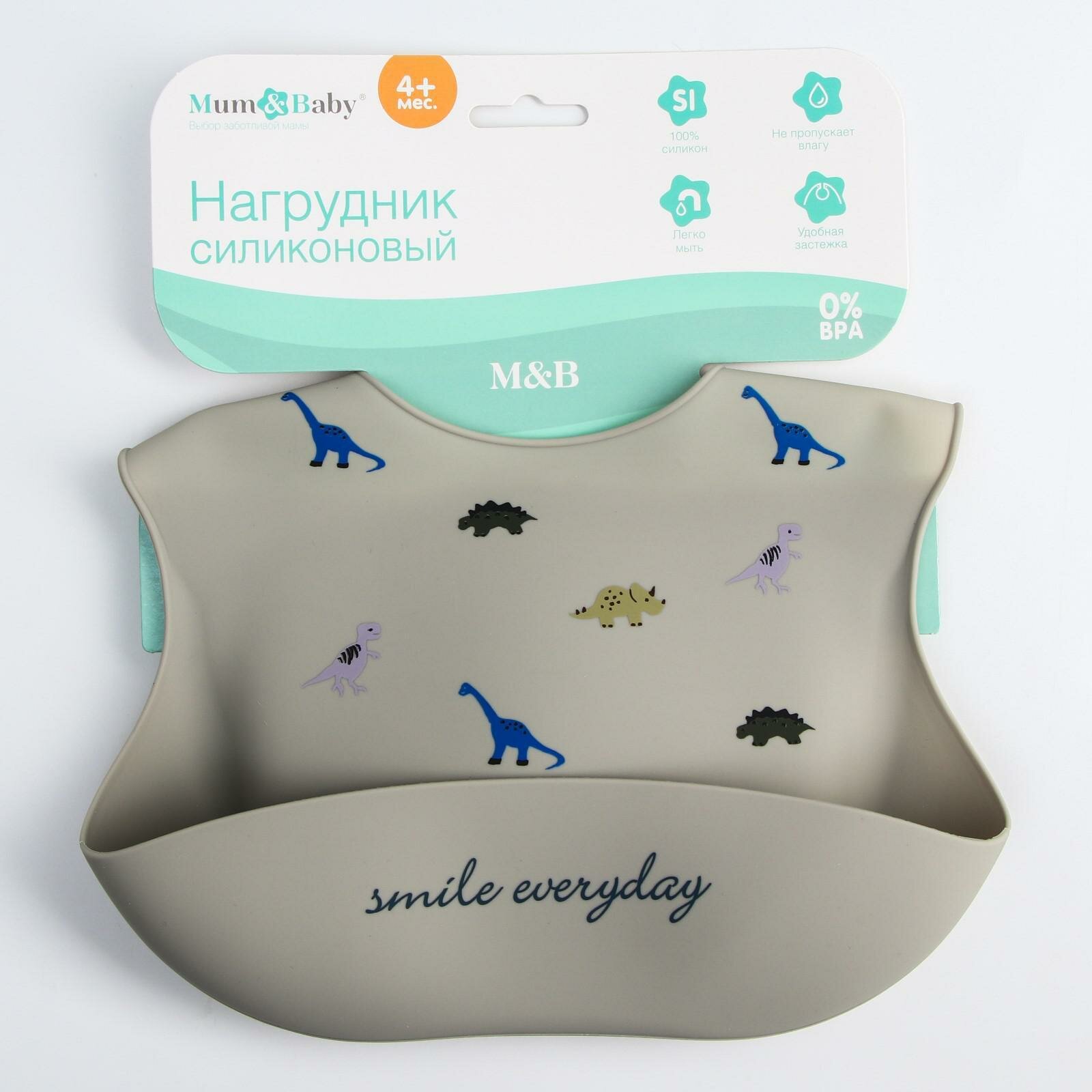 Купить Нагрудник для кормления «Динозаврики» силиконовый с карманом, цвет серый
