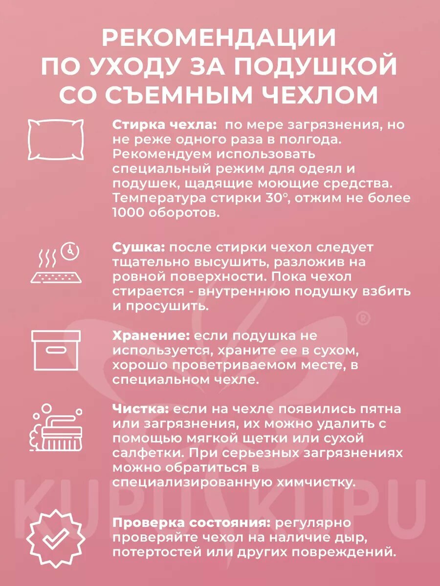 | Отзыв: | Пользуюсь подушкой уже больше года, нигде даже в комки не свалялась, хотя я ее всячески подминаю под себя |