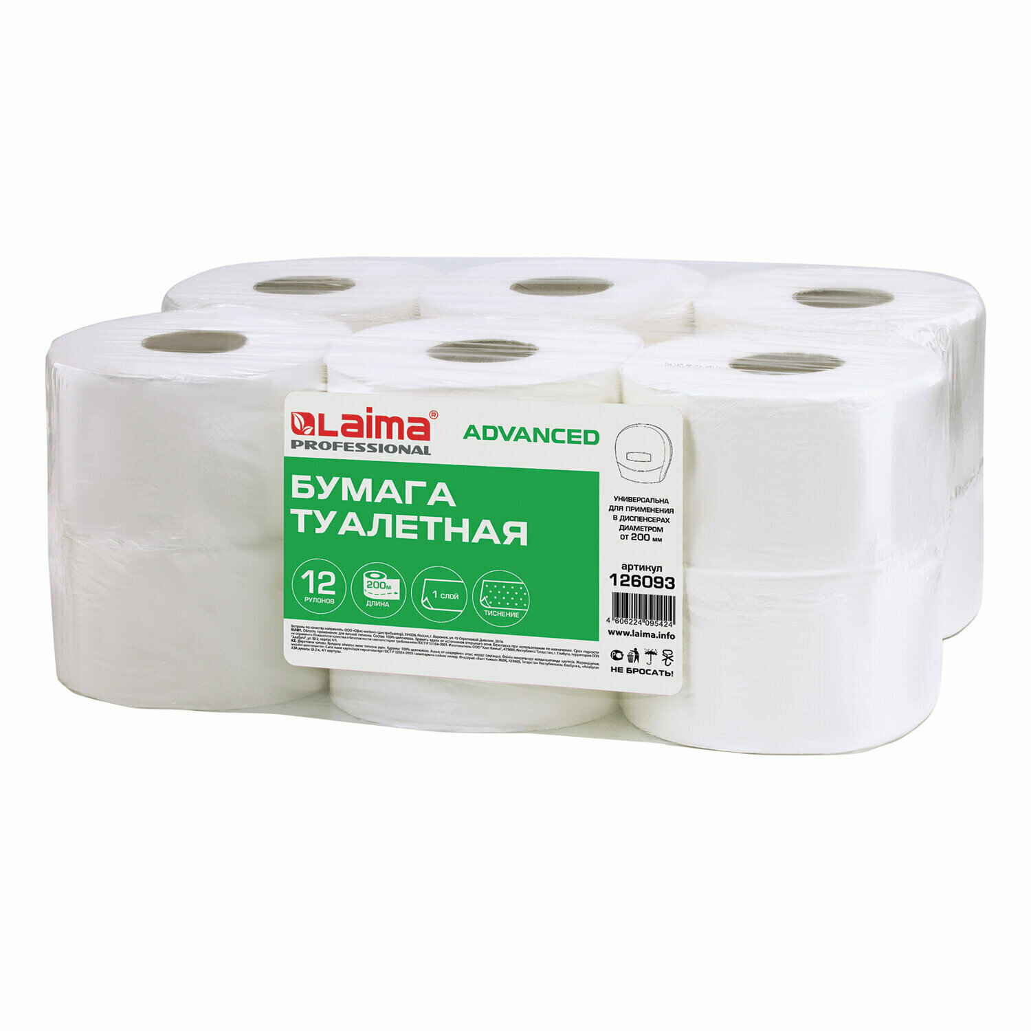 Туалетная бумага LAIMA 200 м, (T2), ADVANCED, 1-слойная, цвет белый, комплект 12 рулонов, 126093