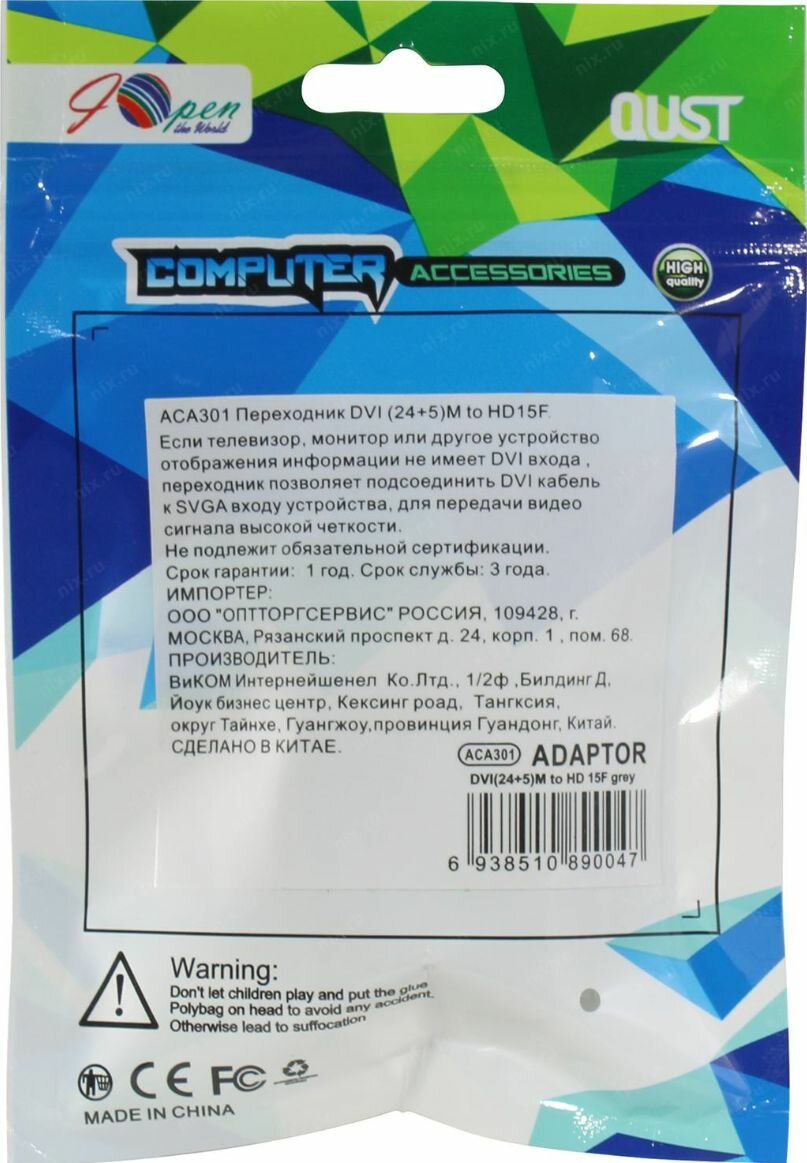 Aopen Qust Переходник DVI-I --> VGA 15F ACA301 6938510890047