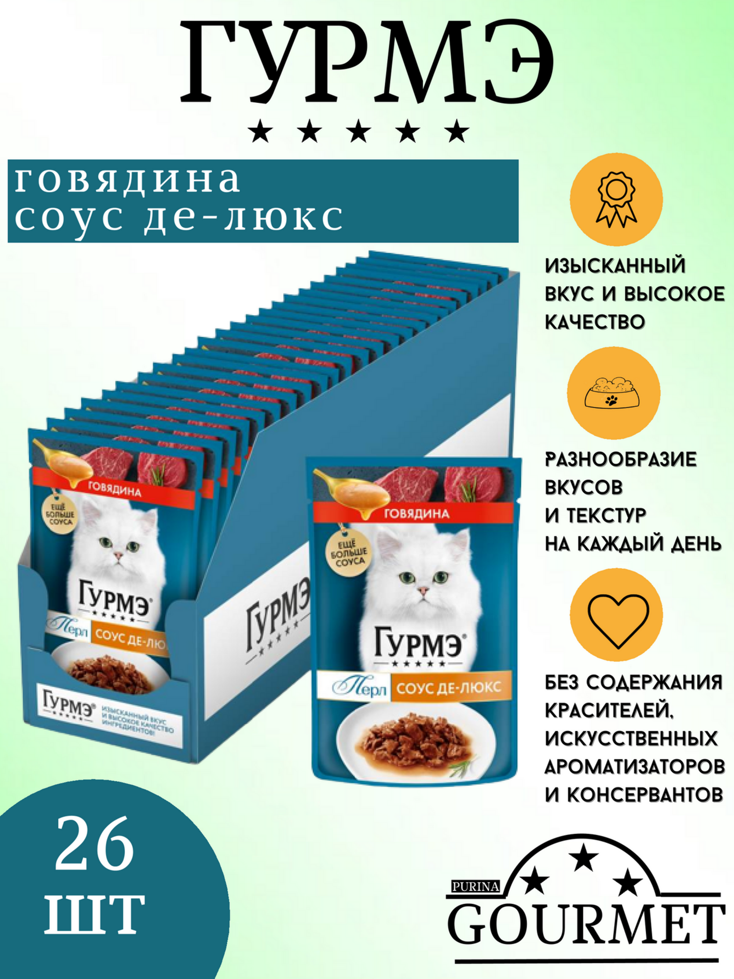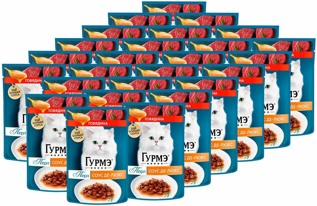 Влажный корм Гурмэ Перл Соус Де-люкс для кошек, с говядиной в роскошном соусе, Пауч, 75 г х 26 шт