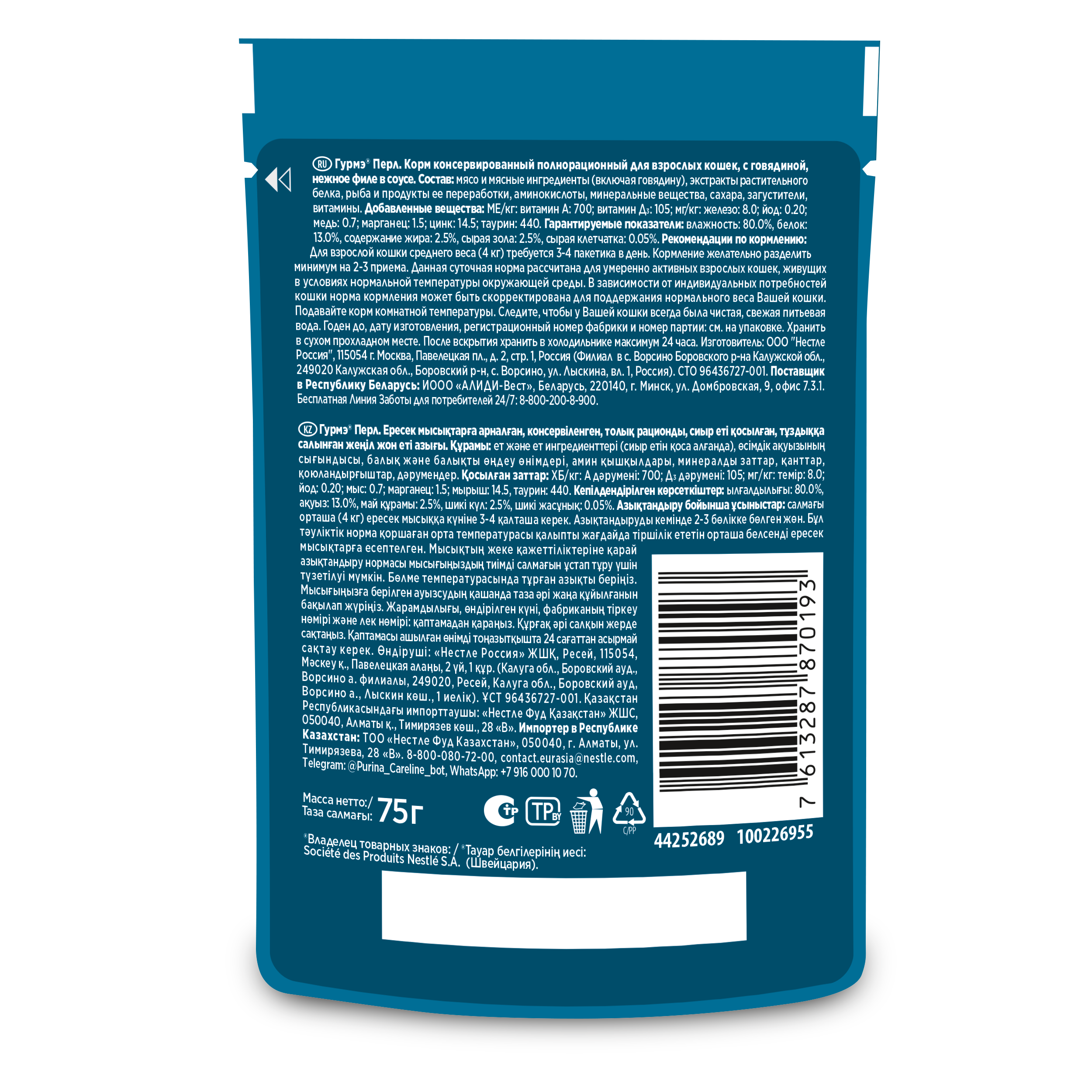 Гурмэ перл соус де-люкс для взрослых кошек с телятиной в соусе пауч 75 гр 75 гр х 10 шт