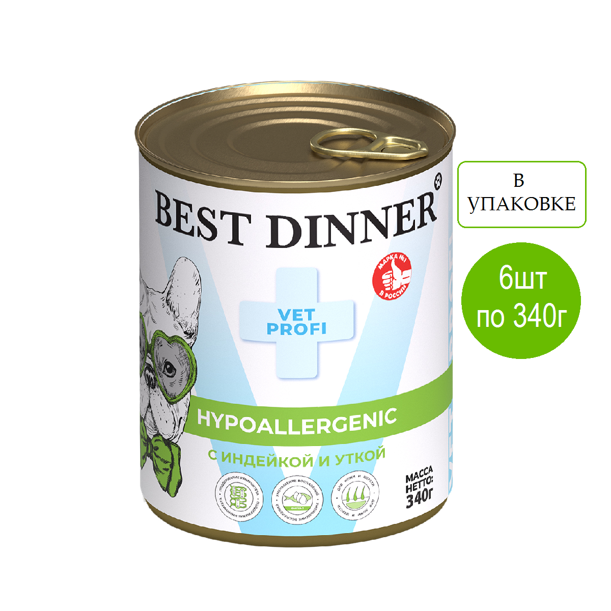 Влажный консервированный корм для собак Best Dinner Exclusive Vet Profi Hypoallergenic С индейкой и уткой, 340г х 6шт