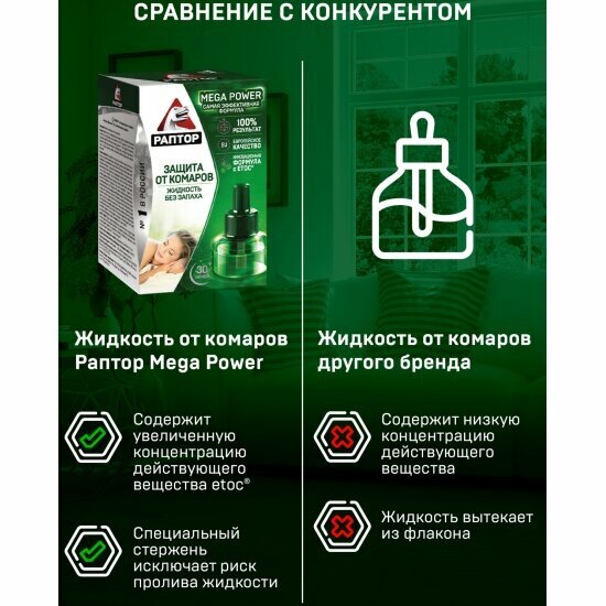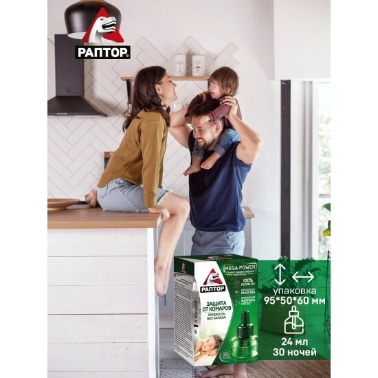 Жидкость для фумигатора Раптор от комаров повышенной эффективности Mega Power, 60 г, 24 мл, 30 ночей, зеленый