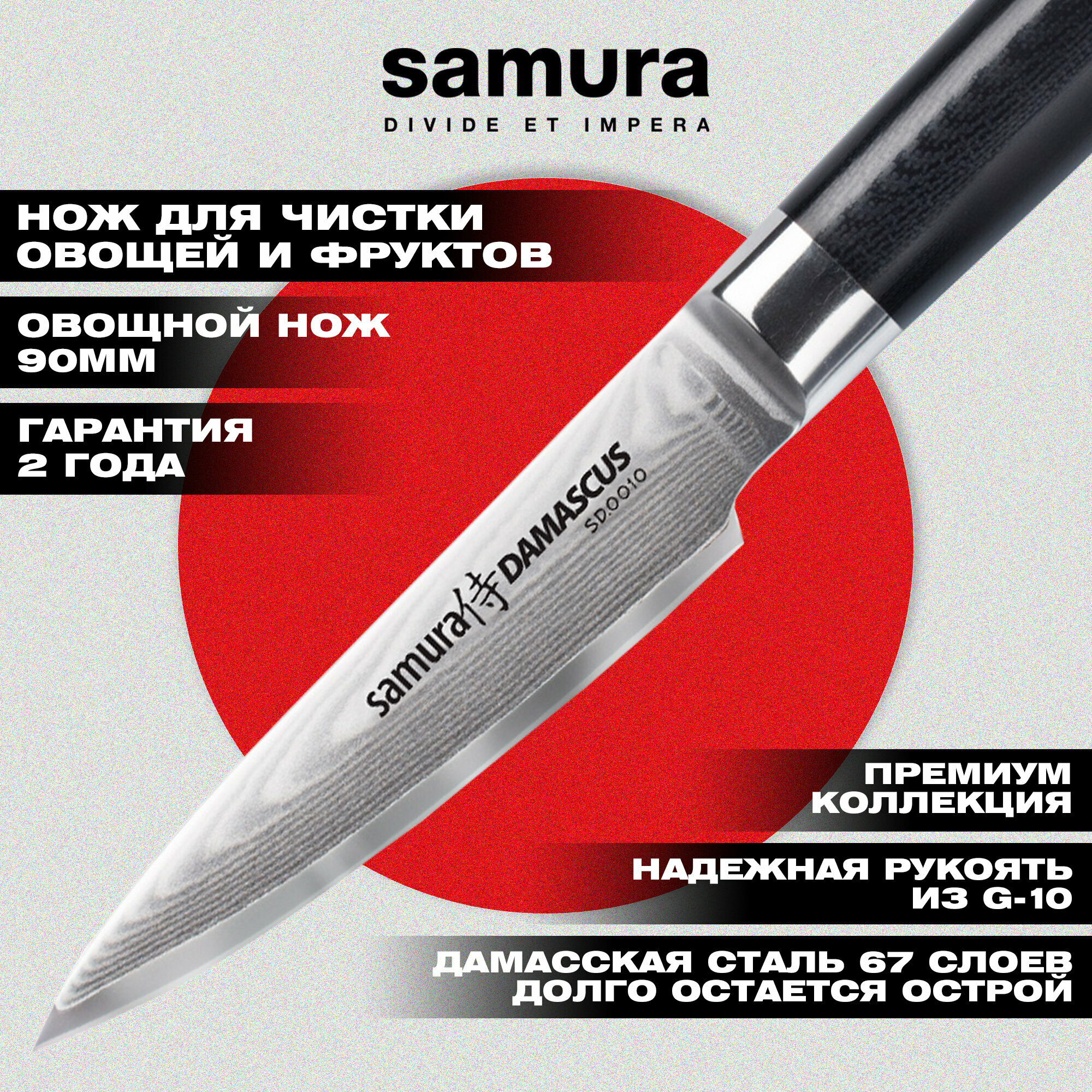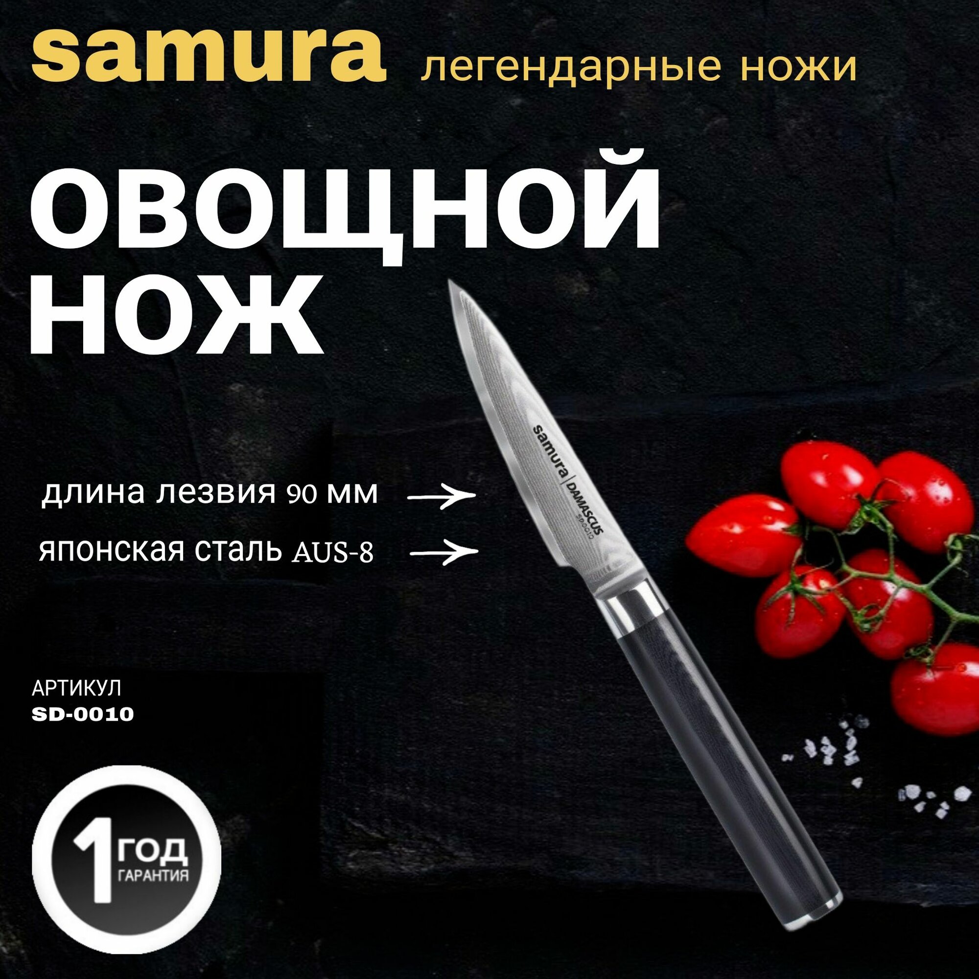Нож кухонный для овощей Samura DAMASCUS SD-0010, 9 см, черный интересное: