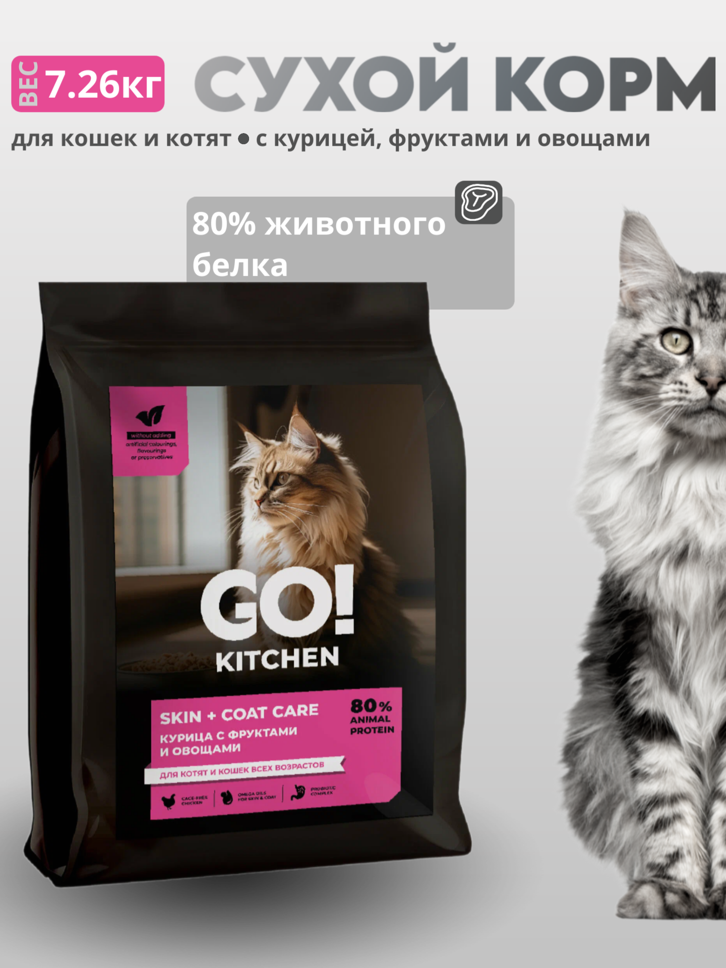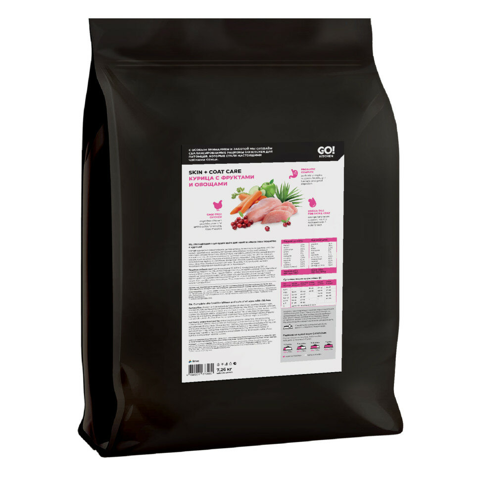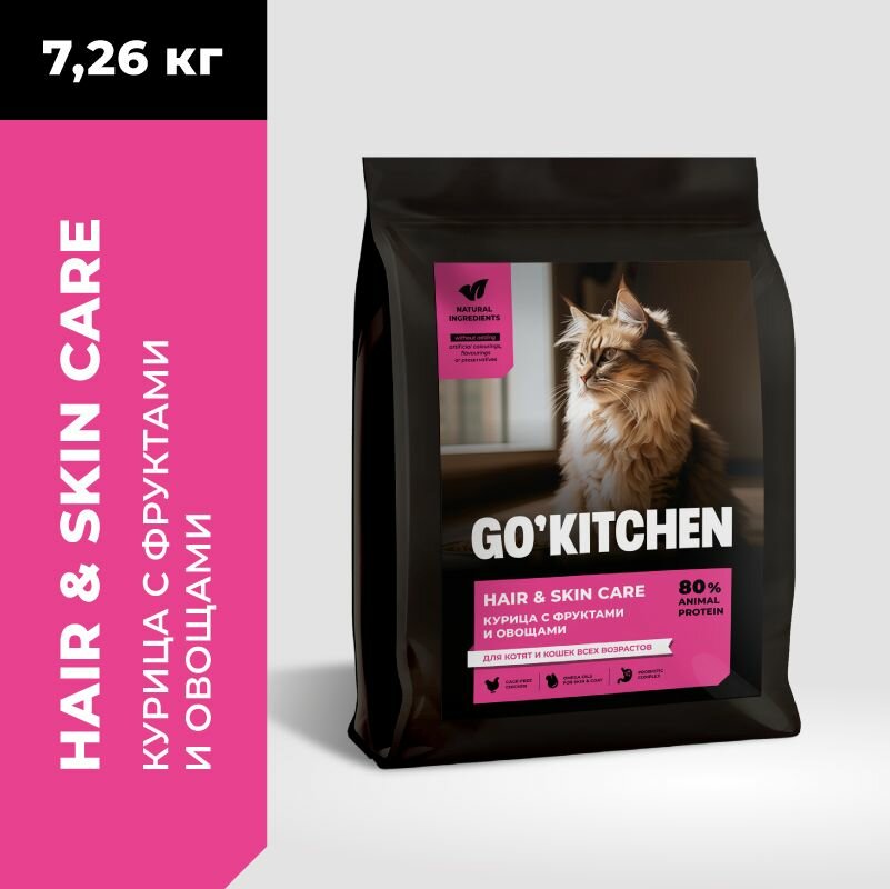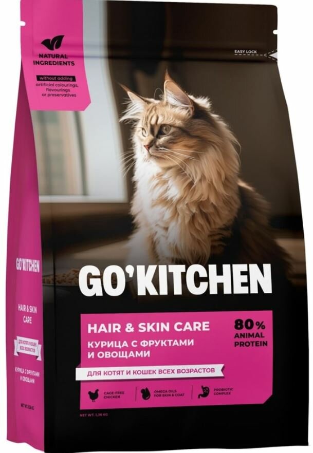 GO'KITCHEN сухой корм для котят и кошек всех возрастов со свежей курицей, фруктами и овощами, HAIR+SKIN CARE Chicken 3,63 кг