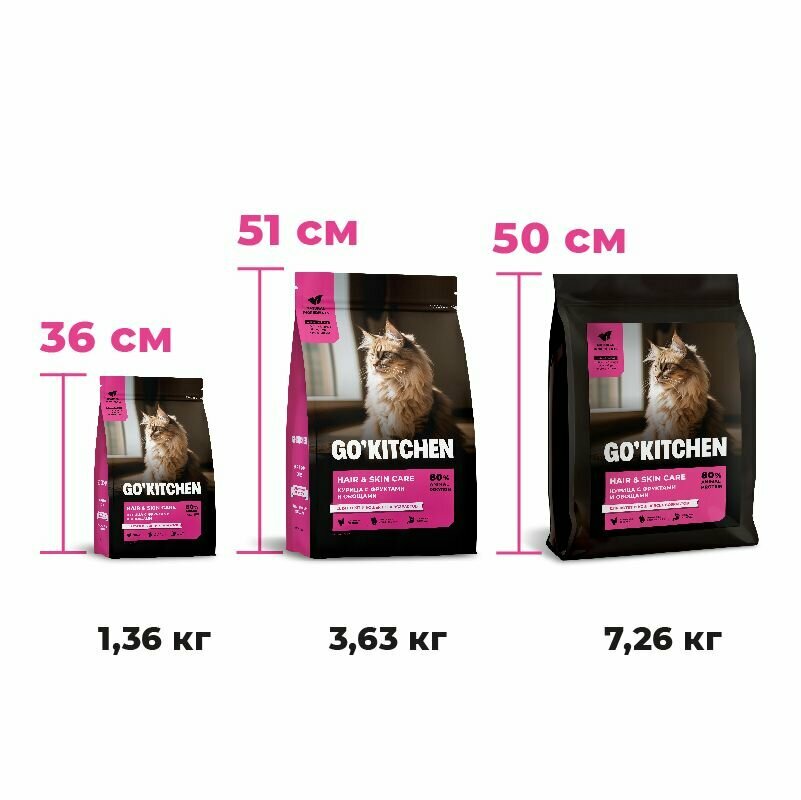 GO'KITCHEN сухой корм для котят и кошек всех возрастов со свежей курицей, фруктами и овощами, HAIR+SKIN CARE Chicken 3,63 кг