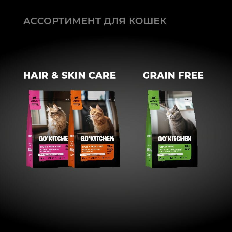 GO'KITCHEN сухой корм для котят и кошек всех возрастов со свежим лососем, фруктами и овощами, HAIR+SKIN CARE Salmon (3.63 кг)