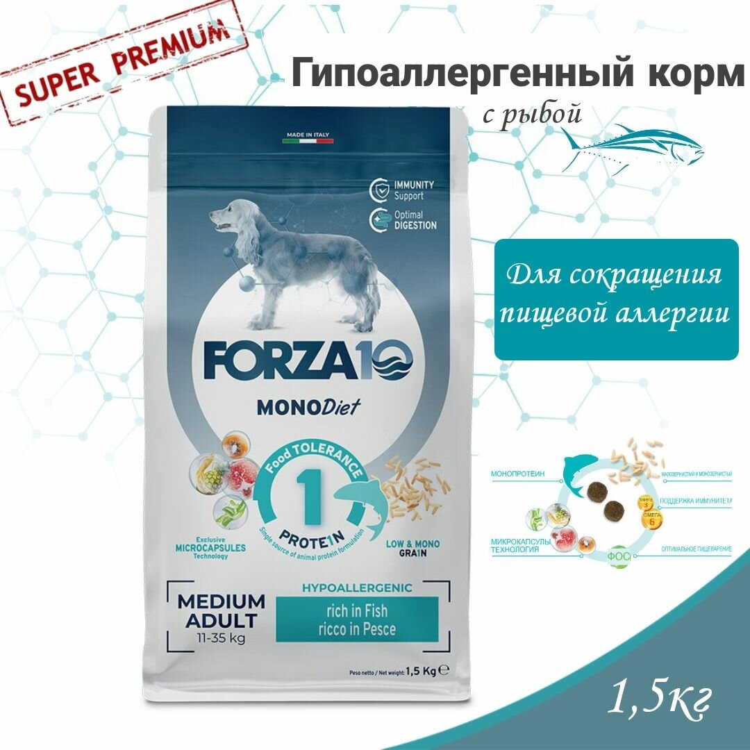 Купить FORZA10 DOG MEDIUM MONODIET монобелковый для взрослых собак средних пород при аллергии с рыбой (1,5 кг)