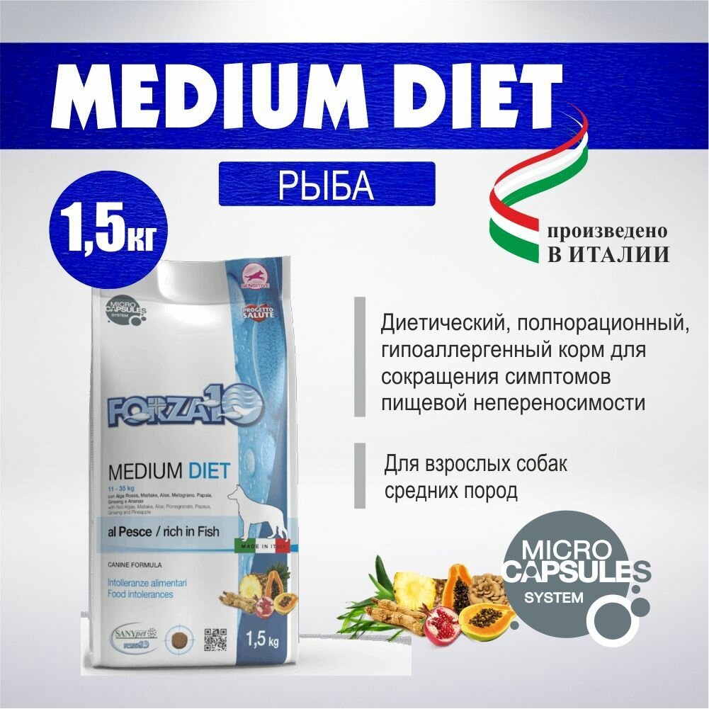 Корм сухой Forza10 "Diet" для взрослых собак средних пород, с океанической рыбой с микрокапсулами, 1,5 кг