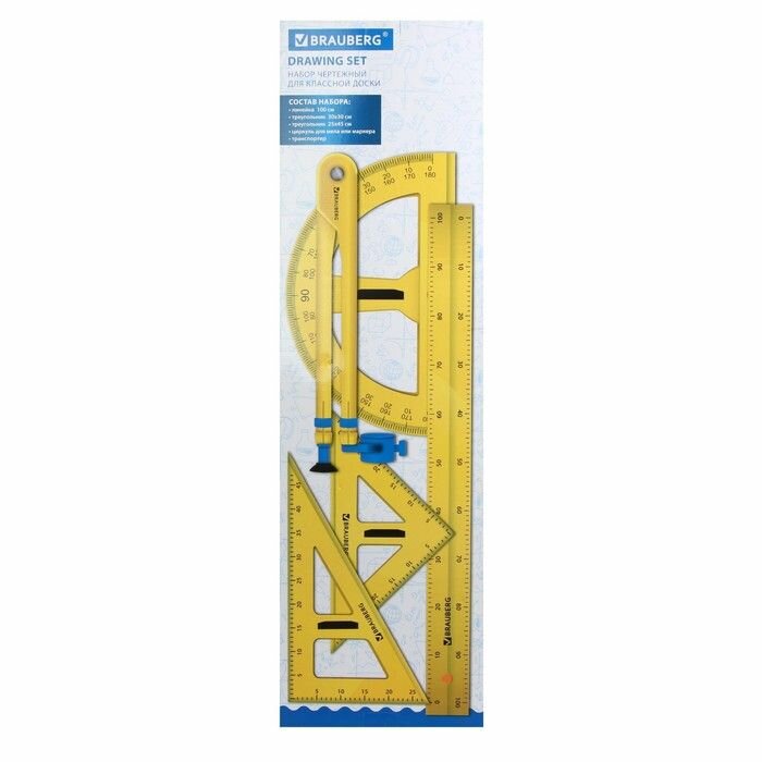 Набор чертежный Brauberg для классной доски (2 треугольника, транспортир, циркуль, линейка 100 см) (210383)