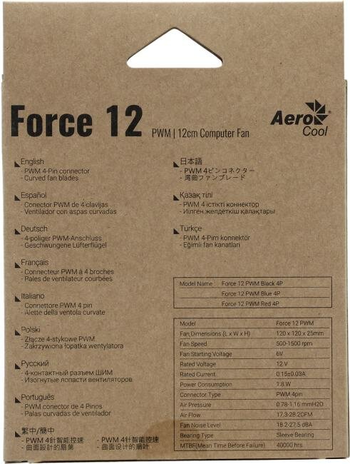 Вентилятор для корпуса AeroCool Force 12 PWM 4718009158016 black, 120x120x25мм, 500-1500 об./мин., разъем PWM 4-PIN, 18.2-27.5 dBA
