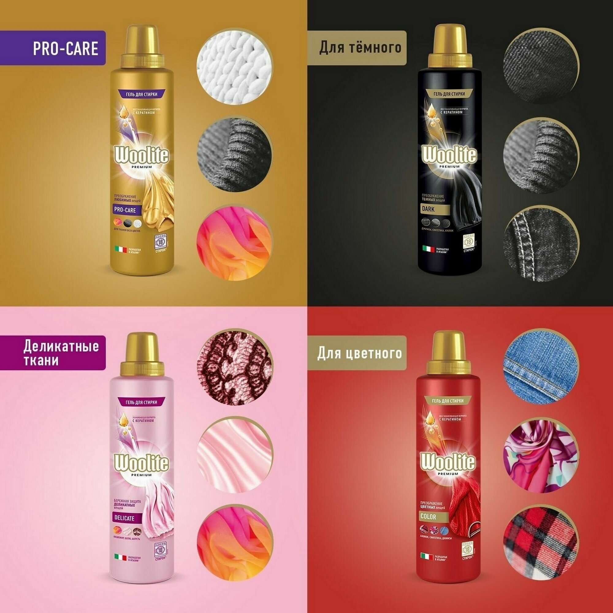 Набор Гелей для стирки Woolite Premium Pro-care 900мл + Delicate 900мл + Dark 900мл + Color 900мл