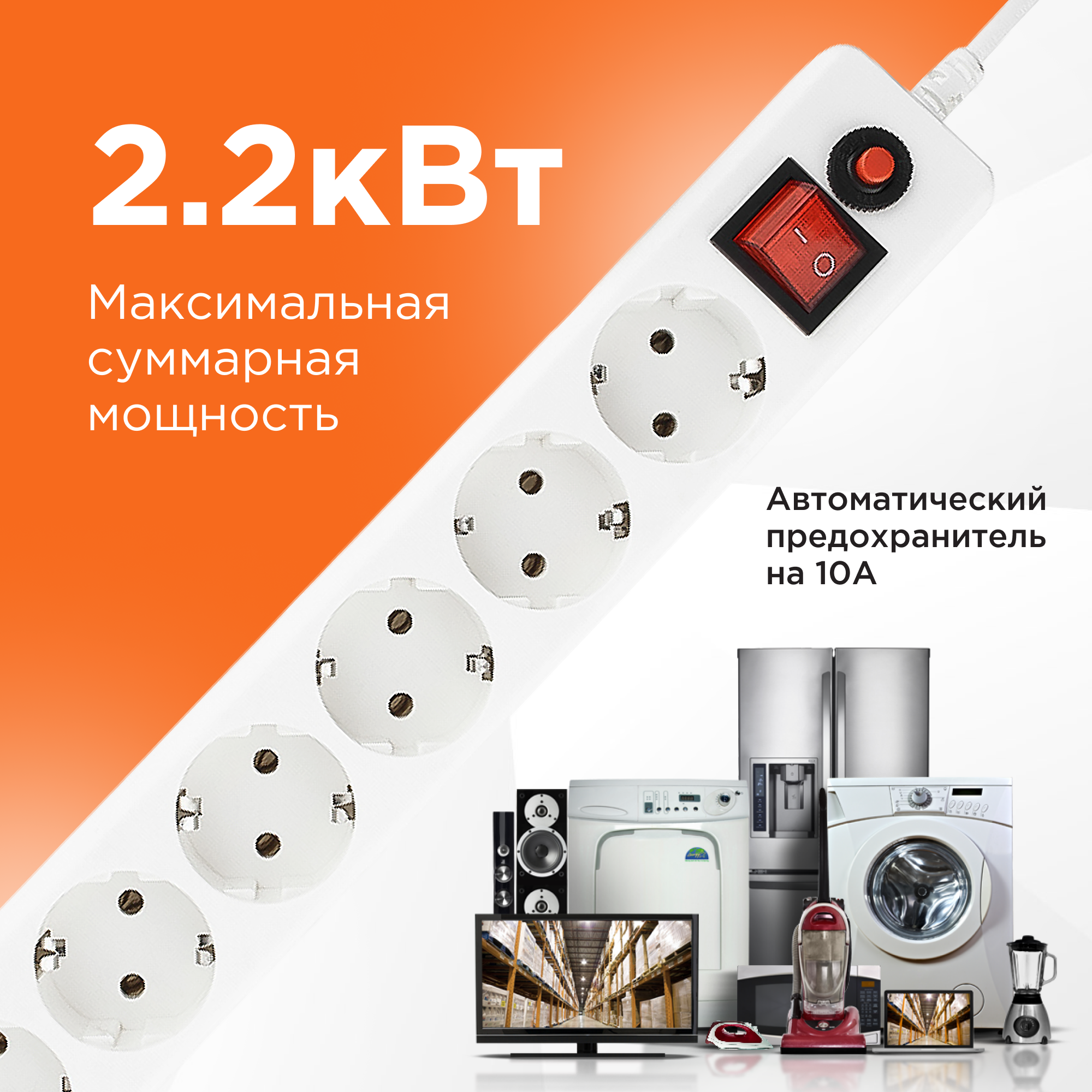 Сетевые фильтры Гарнизон Сетевой фильтр "Гарнизон", 6 розеток, 3 м, 10 А, 2200 Вт, белый