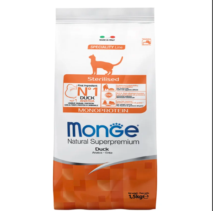 Корм сухой Monge Cat Monoprotein для взрослых стерилизованных кошек, с уткой, 1.5 кг