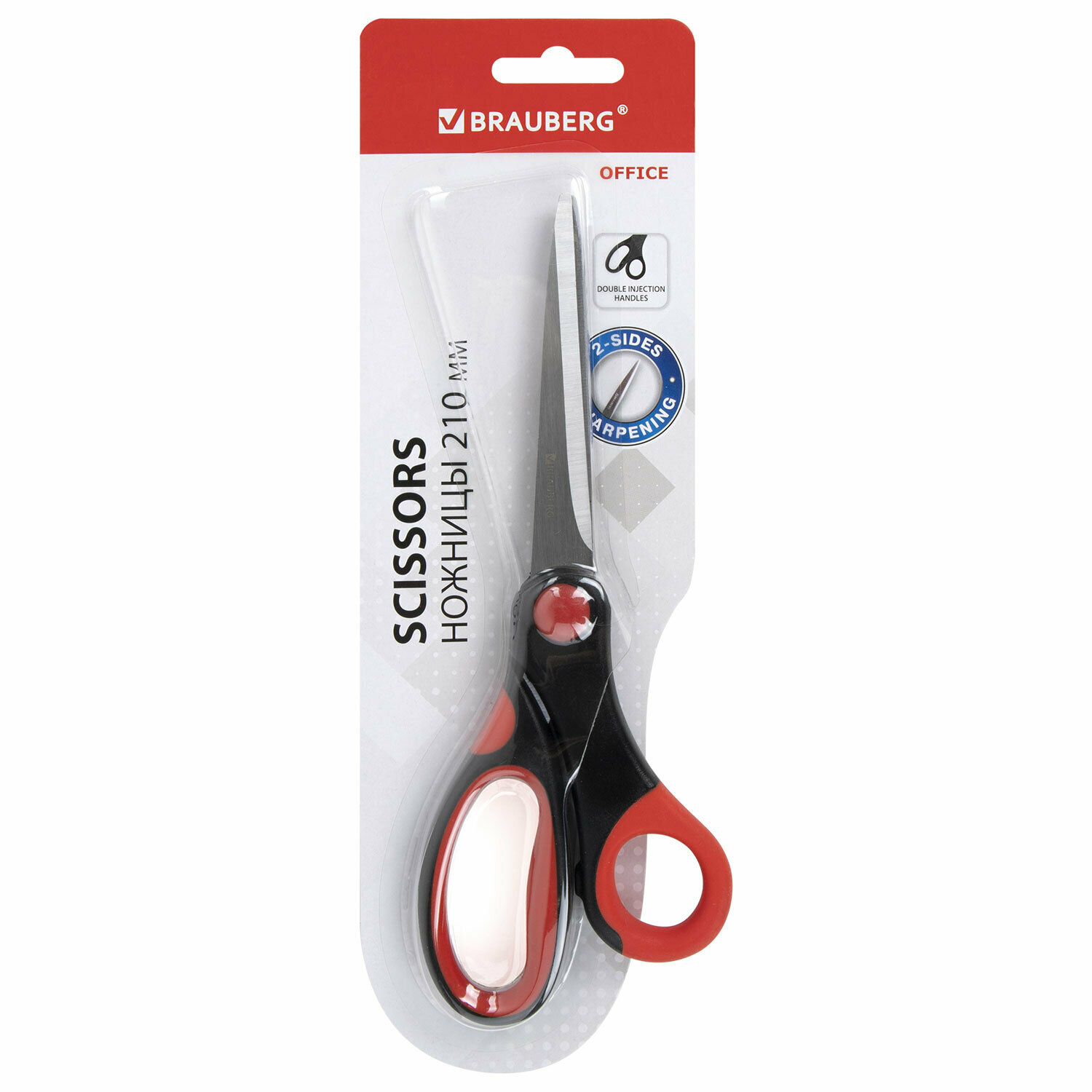Ножницы BRAUBERG "Office", 210 мм, прорезиненные ручки, красно-черные, 2-х сторонняя заточка, блистер, 231566