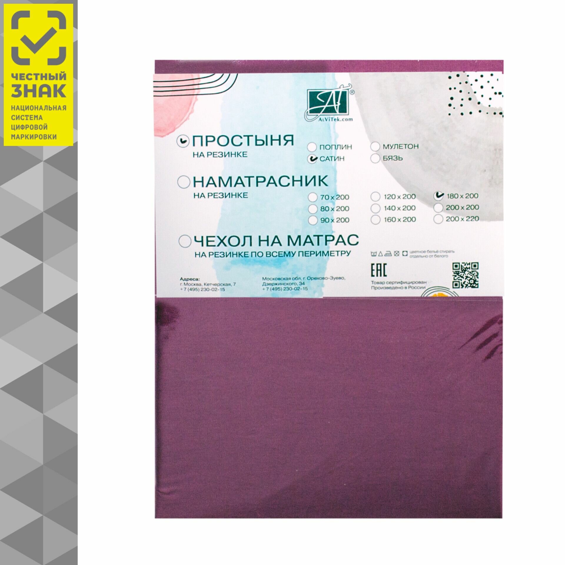 Простыня на резинке Альвитек, 180х200x25, ткань 100% хлопок Сатин, цвет Слива, арт. ПР-СО-Р-180-СЛИ