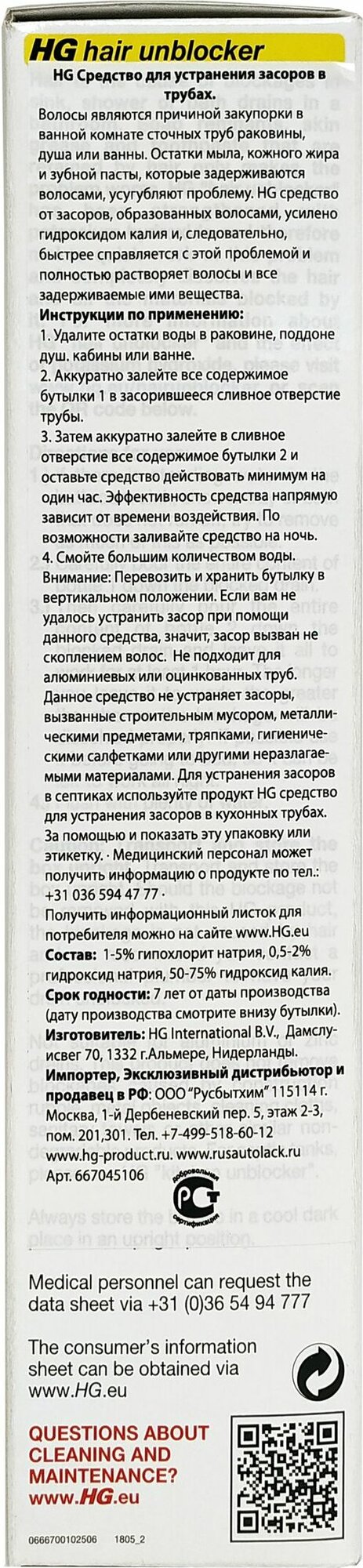 Hg Hair Unblocker 2-ух компонентное 200+250 мл Средство для прочистки труб