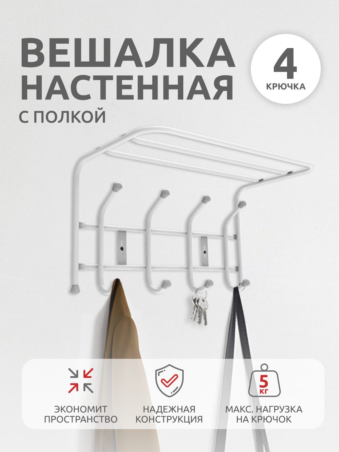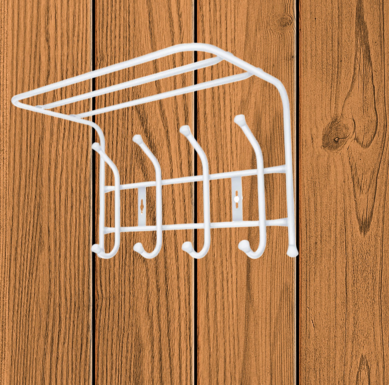 Вешалка с полкой настенная металлическая на 4 крючка ВП4 белый