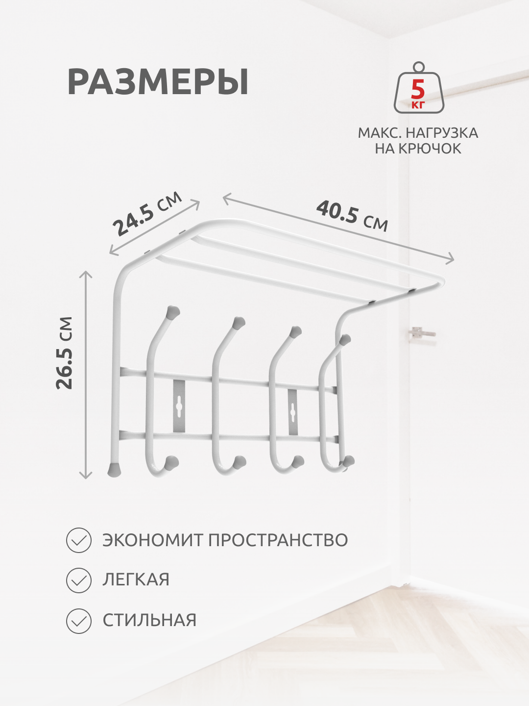 | Плюсы: | Простота установки, 8 крючков (в общей сложности), полка для головных уборов, небольшой вес, подходит для небольшого пространства. |