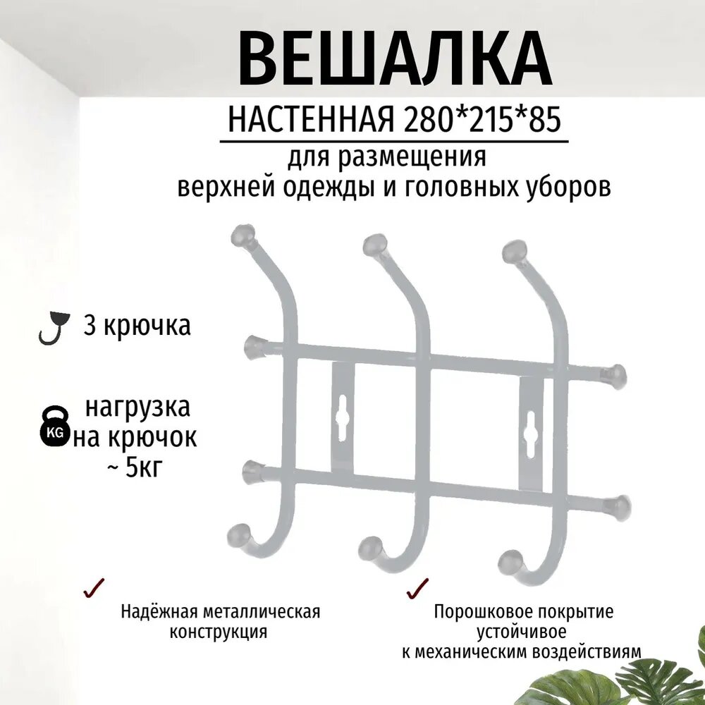 Купить Вешалка настенная 28*21,5*8,5 (3 крючка) матовый серый ВНТ3/МС