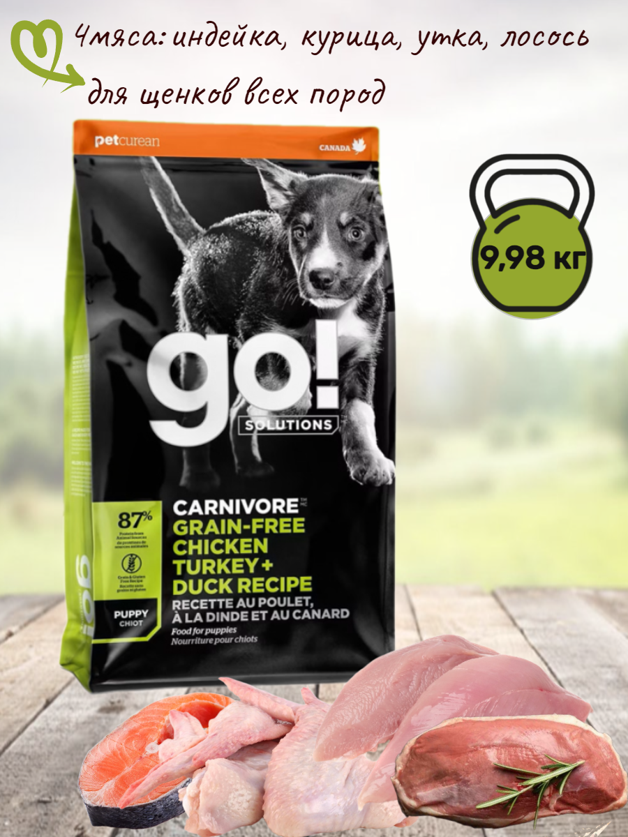GO! Беззерновой для щенков всех пород 4 вида мяса: индейка, курица, лосось, утка (GO! CARNIVORE GF Chicken,Turkey + Duck Puppy Recipe DF), 10 кг 10 кг