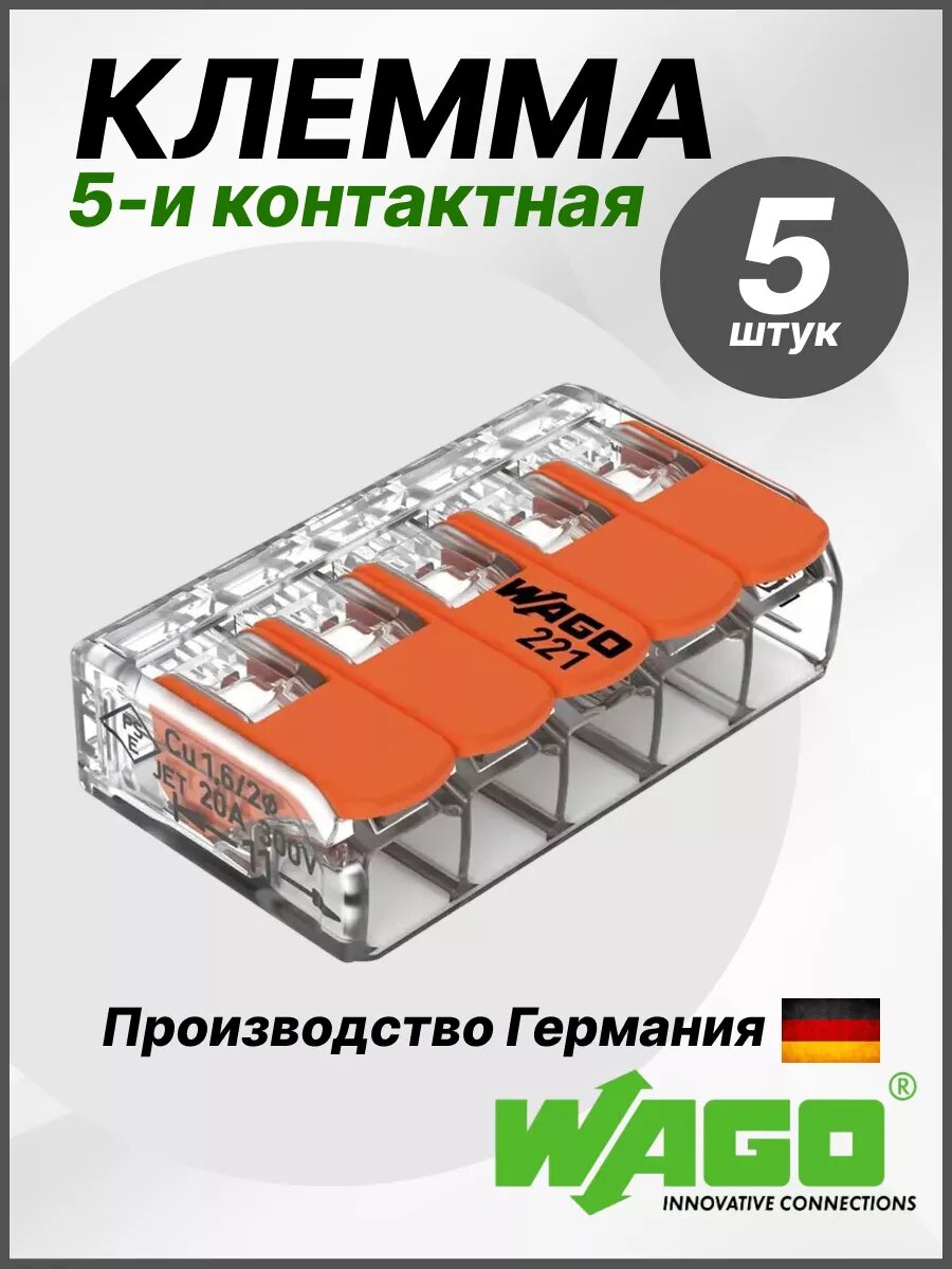 5 проводная клемма Wago 221-415, 20 шт