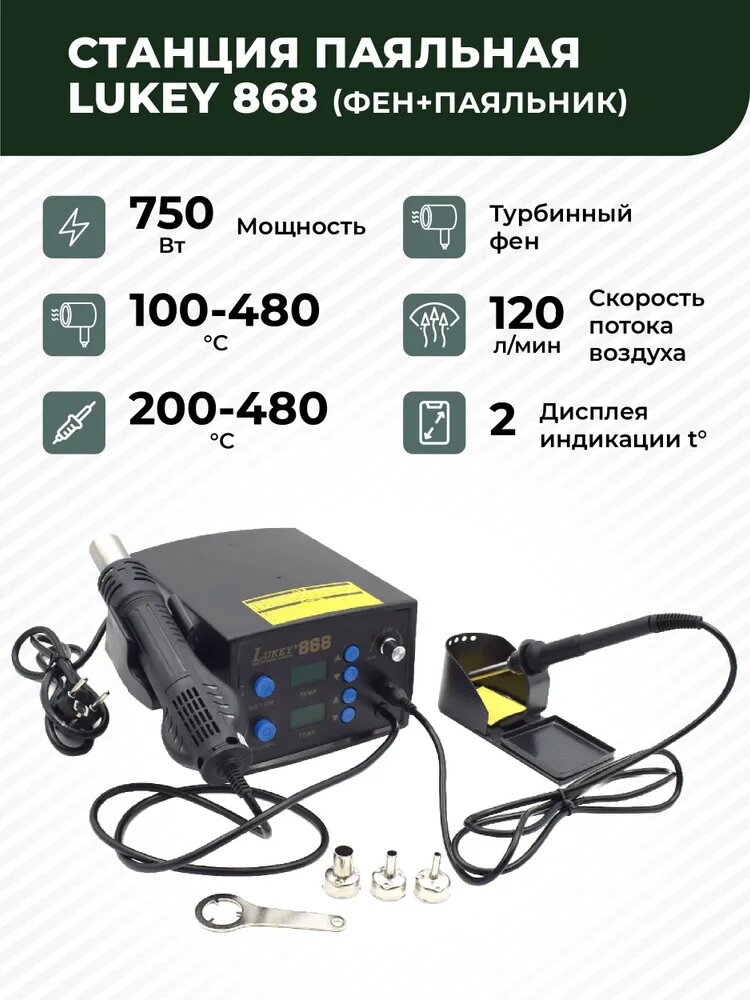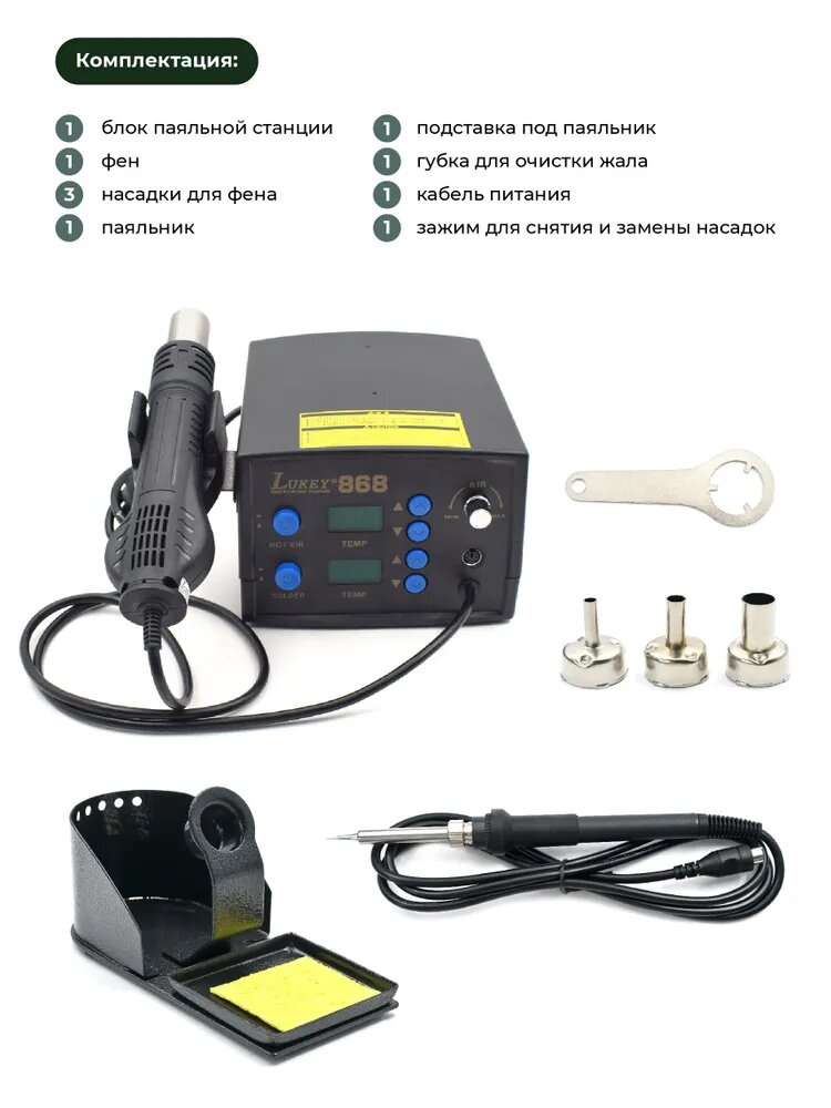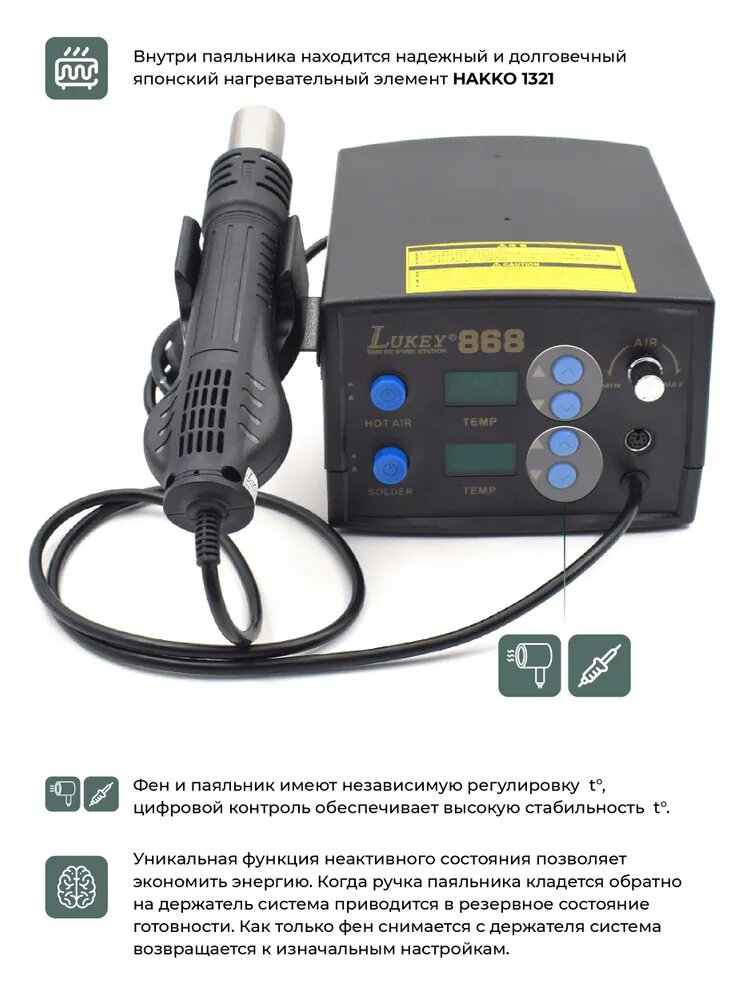 Паяльная станция LUKEY-868 750 Вт, турбинный фен, керамический нагреватель HACCO интересное: