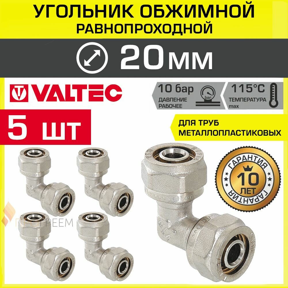 Купить 5 шт - Угольник 90 гр. обжимной 20 х 20 мм VALTEC для металлопластиковых труб 20(2,0) / Переходной фитинг угловой под обжим трубопровода из металлопластика ДУ20, арт. VTm.351.N.002020