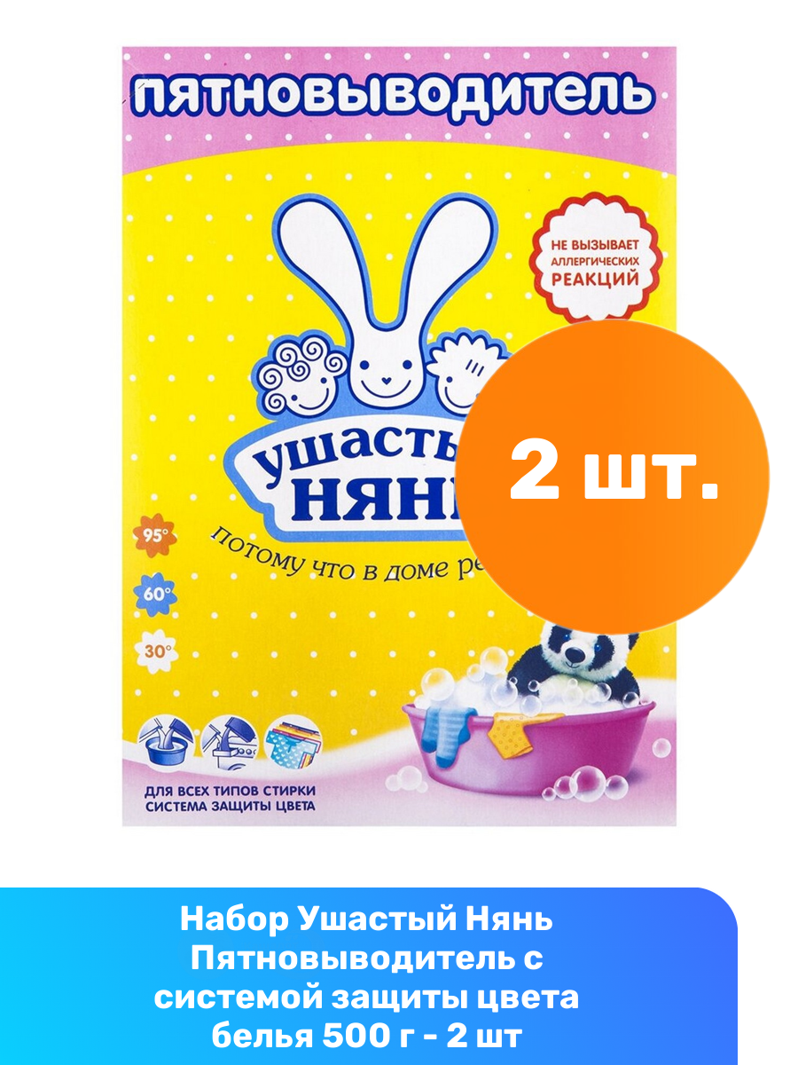 Ниже Вы можете прочитать отзывы на Ушастый Нянь Пятновыводитель с системой защиты цвета белья 500 г - 2 шт, ознакомится с подробными характеристиками, посмотреть интересные обзоры и фотографии на Ушастый Нянь Пятновыводитель с системой защиты цвета белья 500 г - 2 шт.