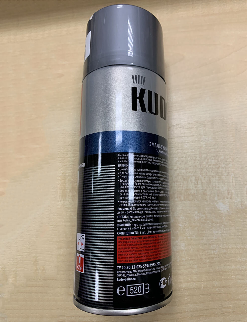 Ниже Вы можете прочитать отзывы на Эмаль аэрозольная Kudo Arte металлик хром зеркальная 520 мл, ознакомится с подробными характеристиками, посмотреть интересные обзоры и фотографии на Эмаль аэрозольная Kudo Arte металлик хром зеркальная 520 мл.