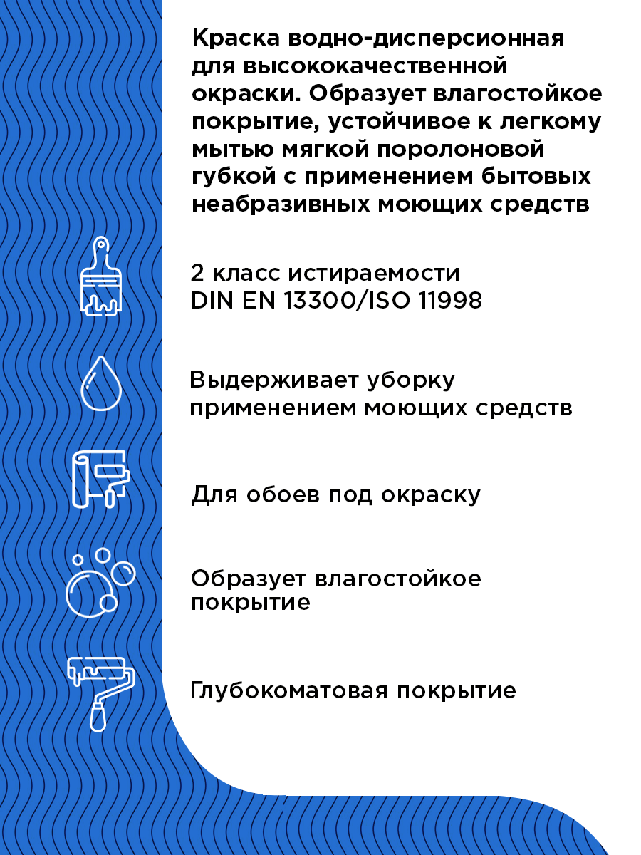 | Плюсы: | Хорошая укрывистость, можно протирать влажной губкой |