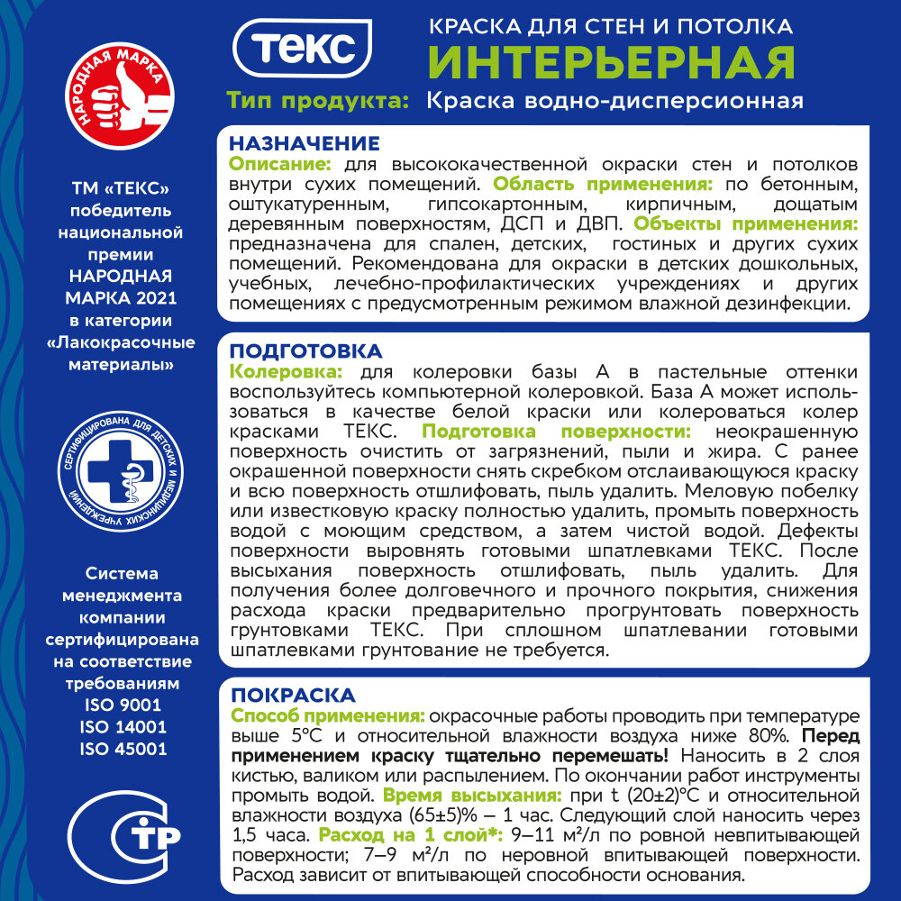 Текс Моющаяся база А белая краска в/д (0,9л) профи / текс Моющаяся base A краска для стен и потолков в сухих и влажных помещениях (0,9л) класс профи
