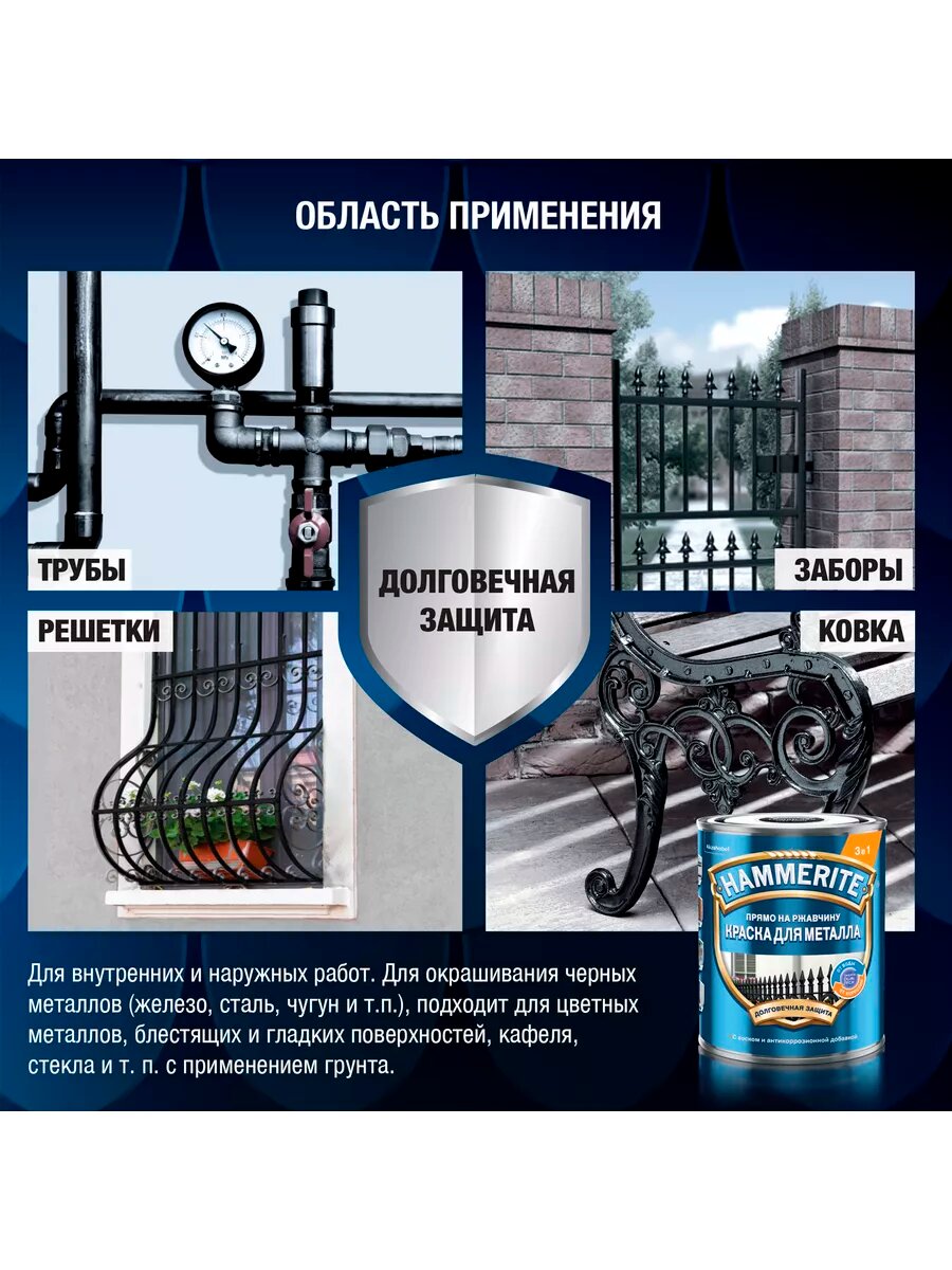 Краска для металла 3 в 1 прямо на ржавчину Hammerite гладкая глянцевая (2л) синий RAL 5005