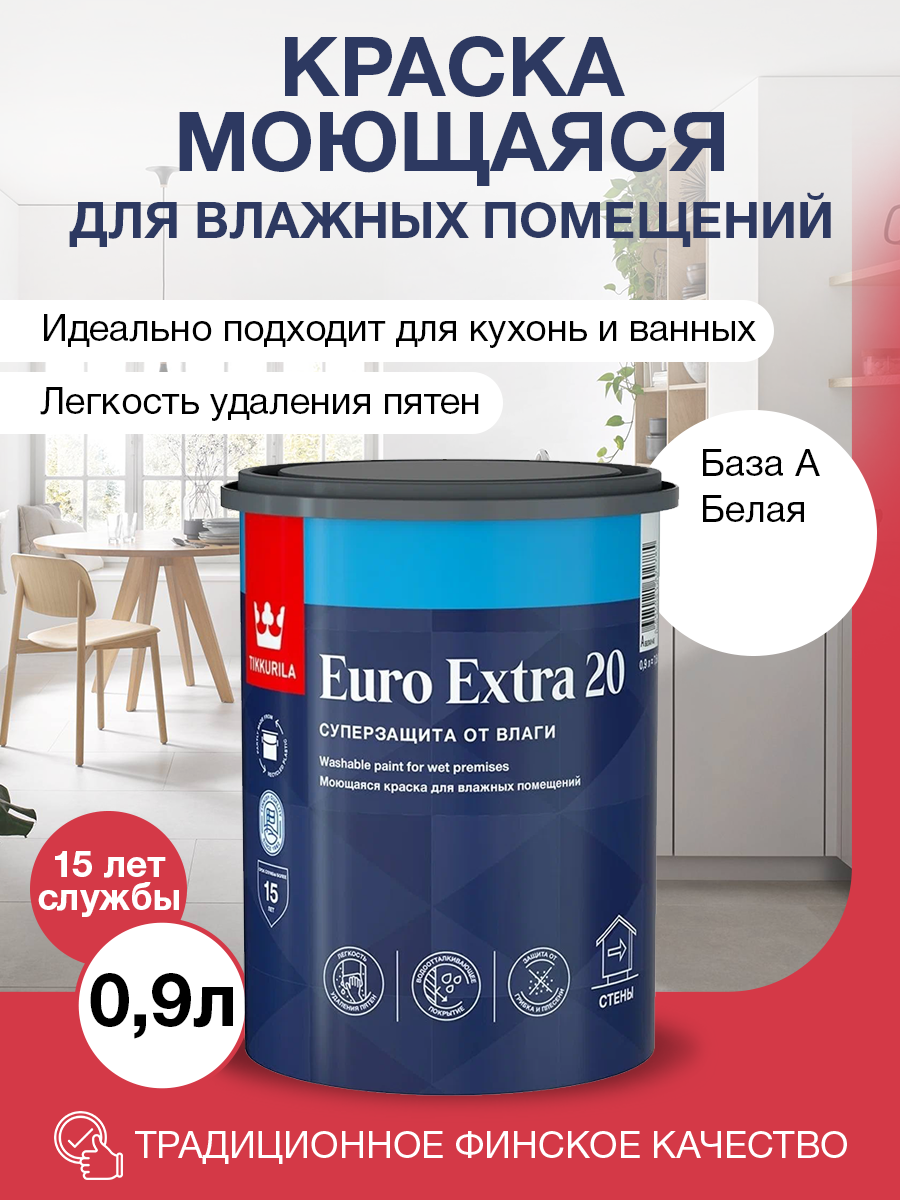 Краска моющаяся Tikkurila Euro Extra 20 для влажных помещений база А 0.9 л