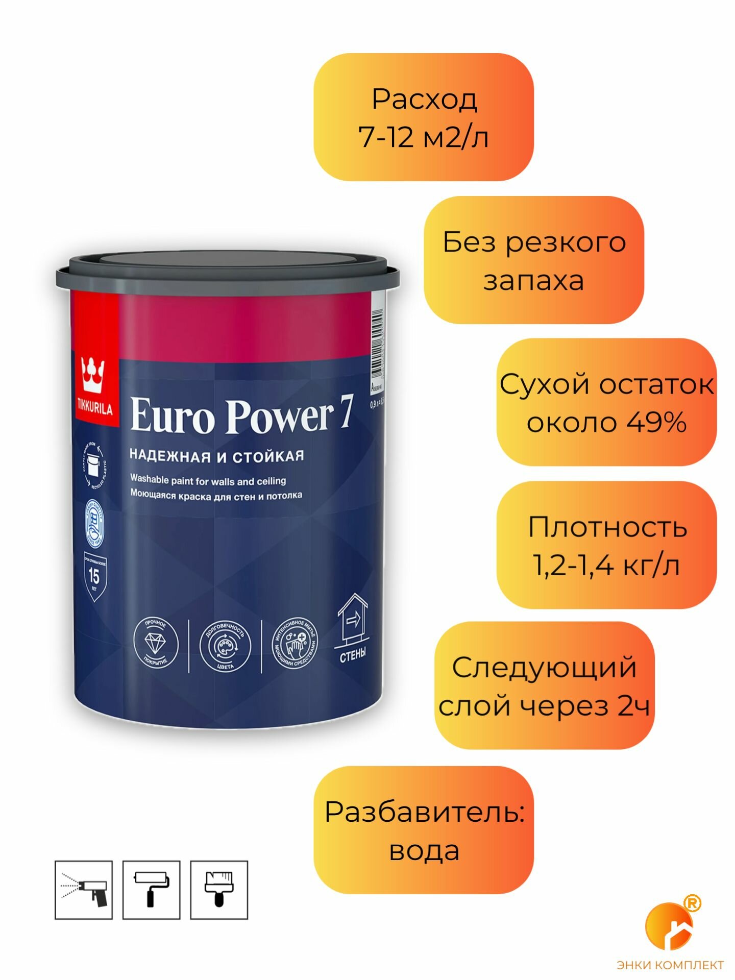 Краска В/Д TIKKURILA (EURO POWER 7, 0,9 л, Моющаяся, д/стен и потолков, Бесцветная. (ЦБ-00000718))