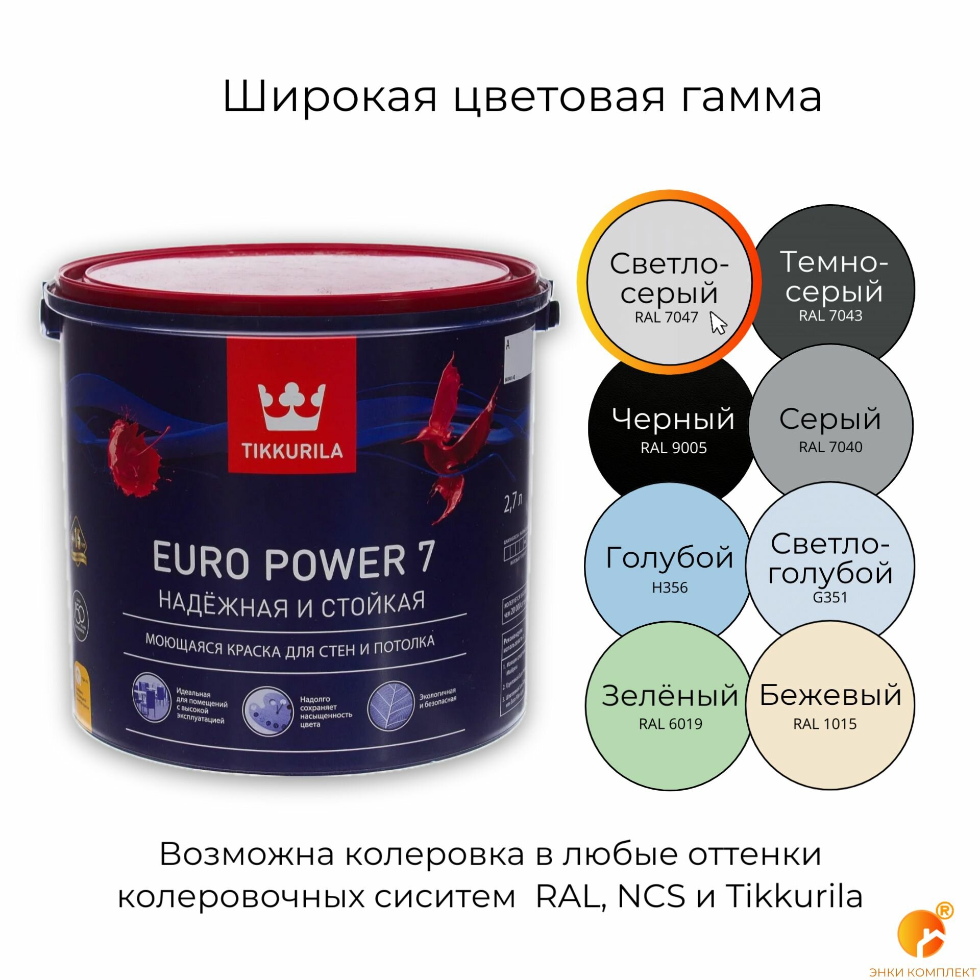 СохранитьКраска интерьерная EURO POWER 7 A RAL 7047 (светло-серый), матовая, стойкая к мытью 2,7л Tikkurila интересное: