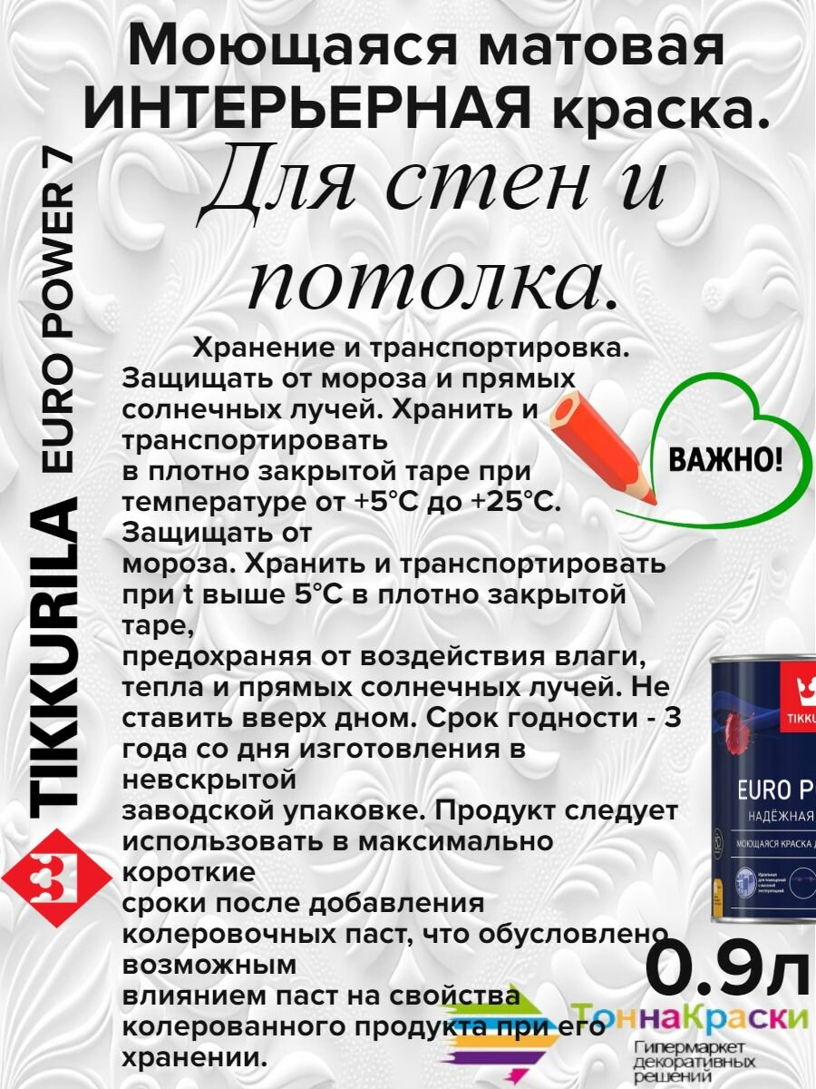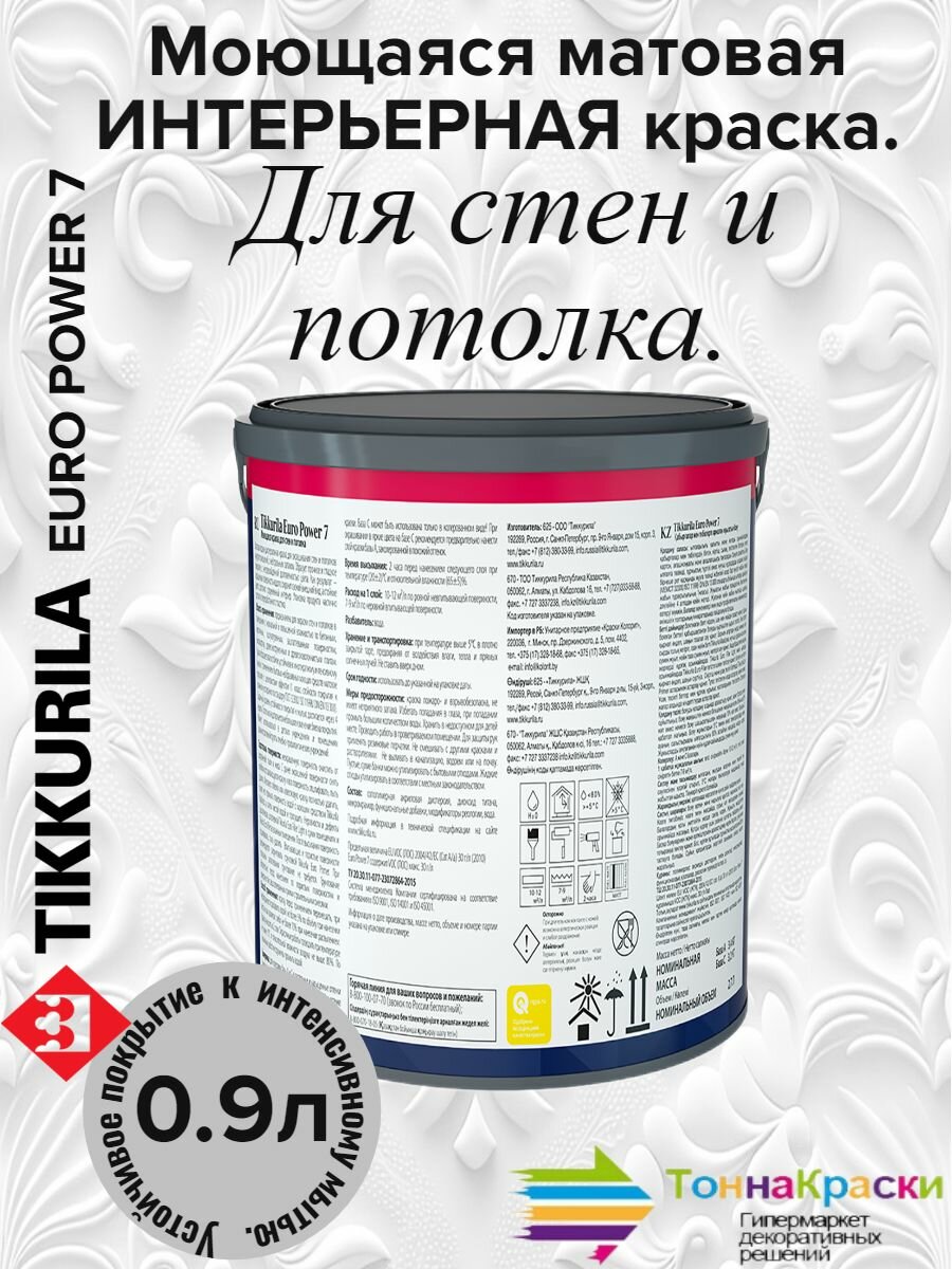 Краска TIKKURILA EURO POWER 7 моющаяся для стен и потолка, матовая, база A 0,9л 700001118