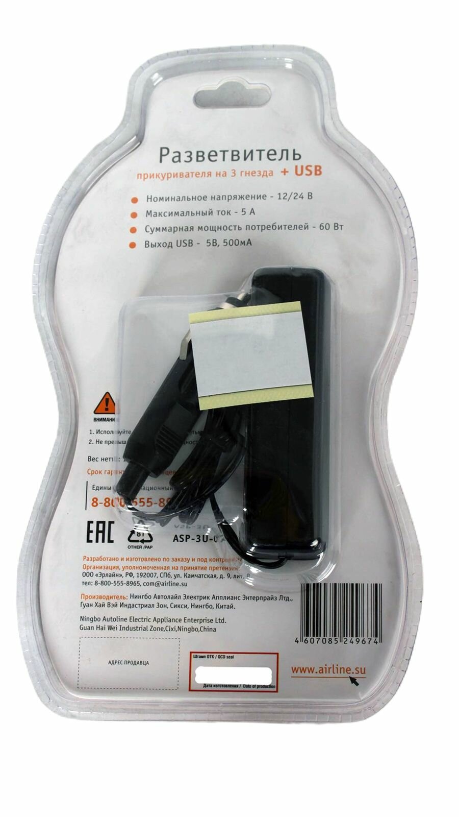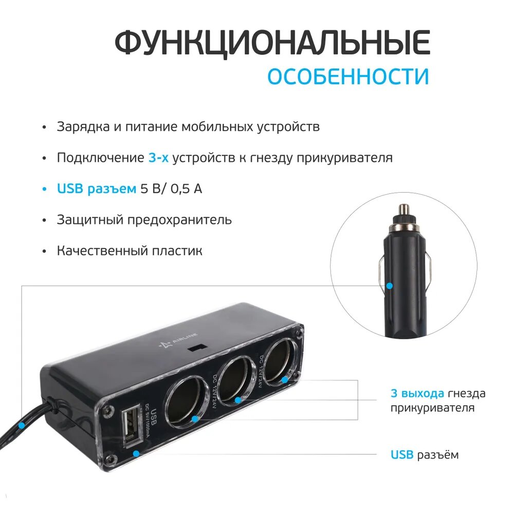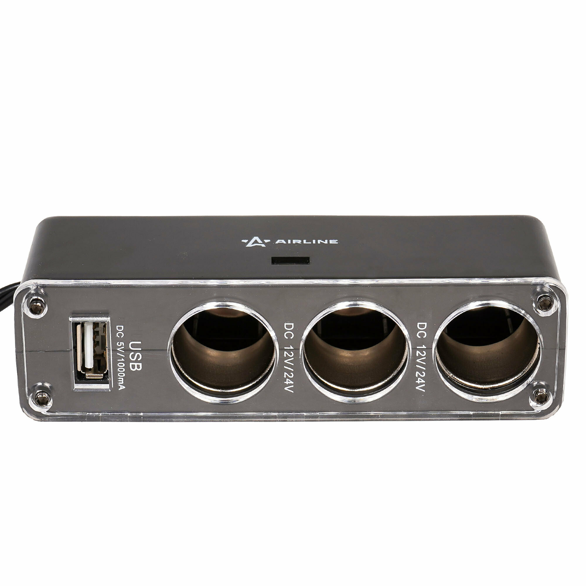 AIRLINE ASP-3U-07 Прикуриватель-разветвитель на 3 гнезда + USB (черный)
