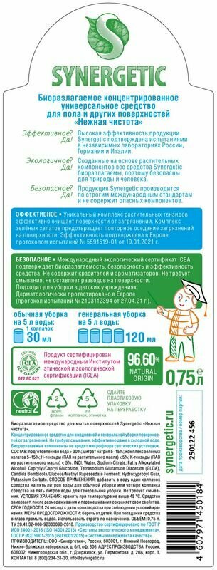 Synergetic Средство для мытья полов Synergetic "Нежная чистота", биоразлагаемое,концентрированное 750 мл