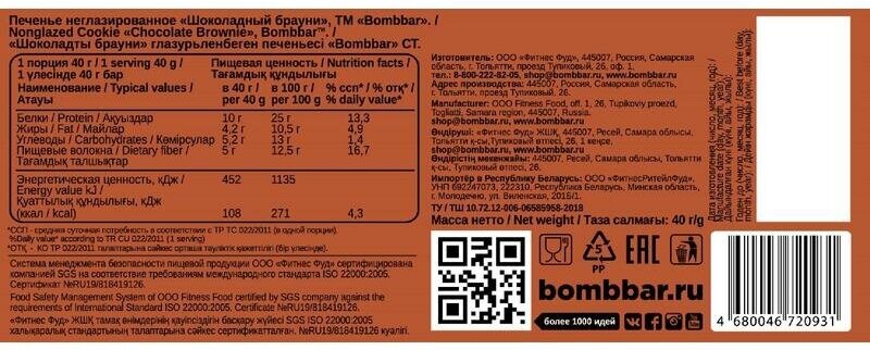 Протеиновое печенье Bombbar шоколадный брауни 40 гр., 12 шт.