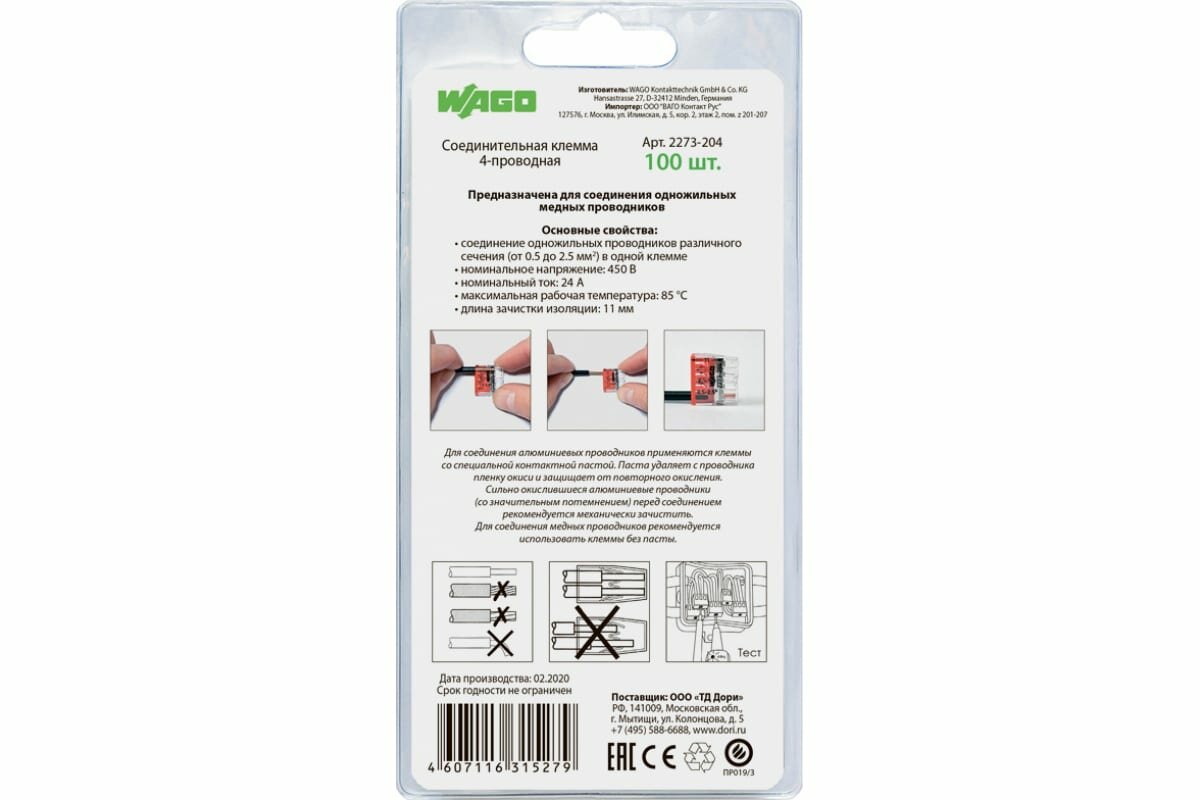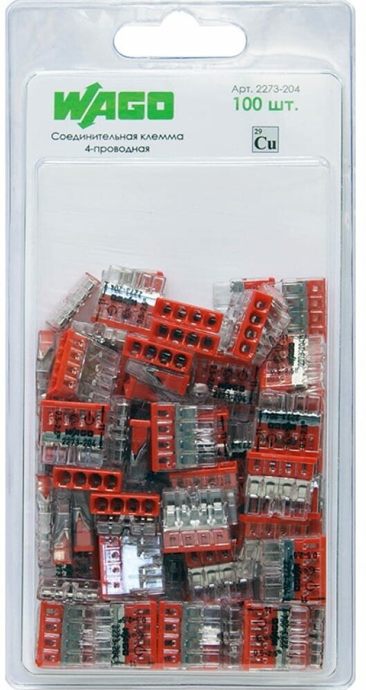 WAGO Соединительная клемма WAGO 4-х проводная (2273-204) 6 шт. в блистере