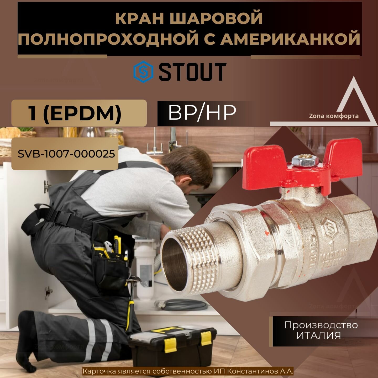 SVB-1007-000025 STOUT Кран шаровой полнопроходной с "американкой", ВР/НР, ручка бабочка 1 (EPDM)